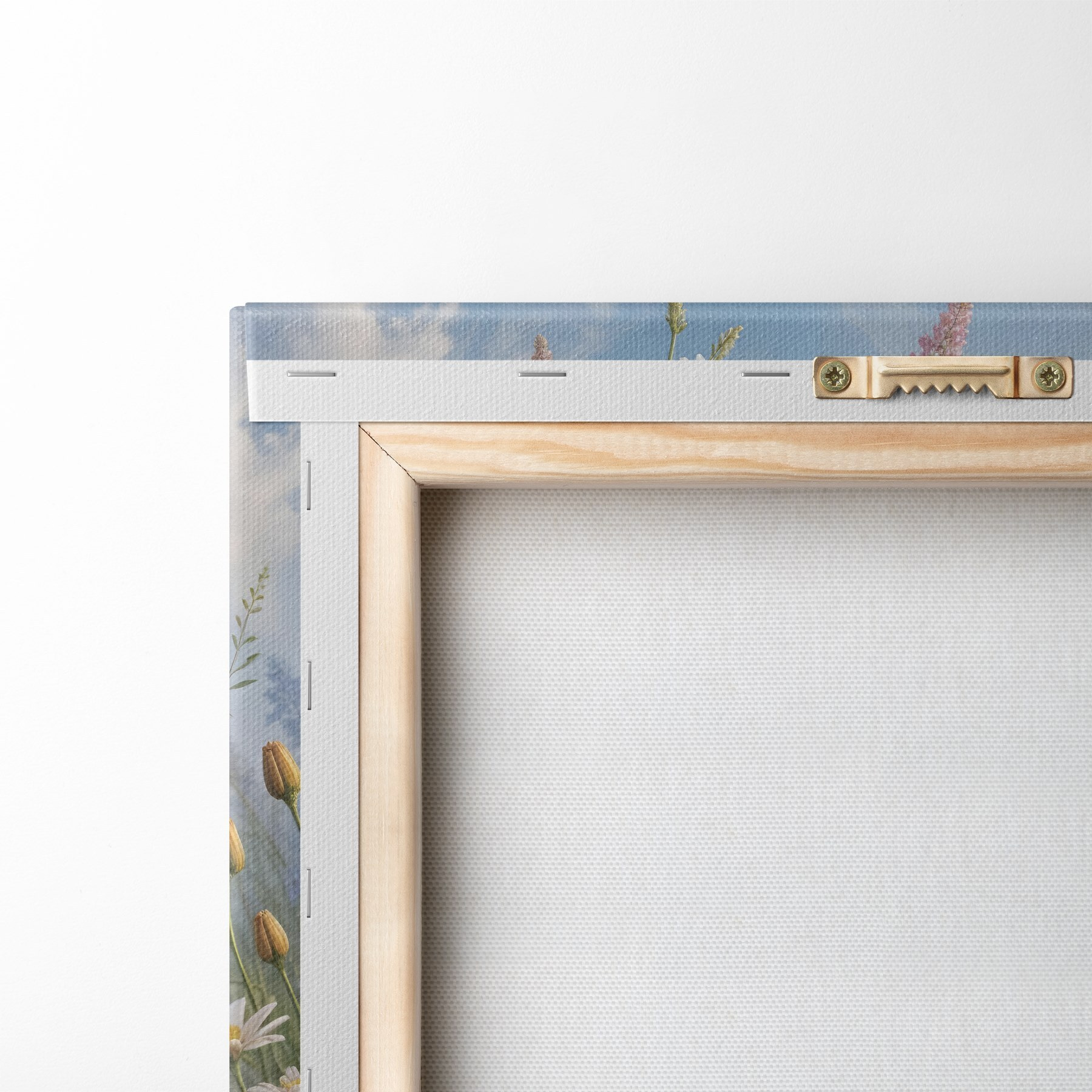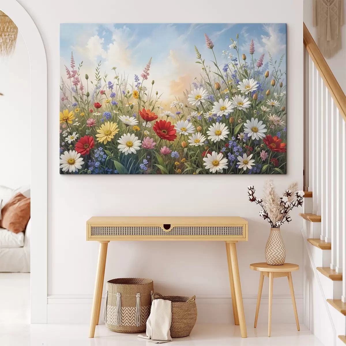 Quadri Un campo di fiori selvatici colorati, tra cui margherite, papaveri e altre piante in fiore, in un cielo blu Nr s41725