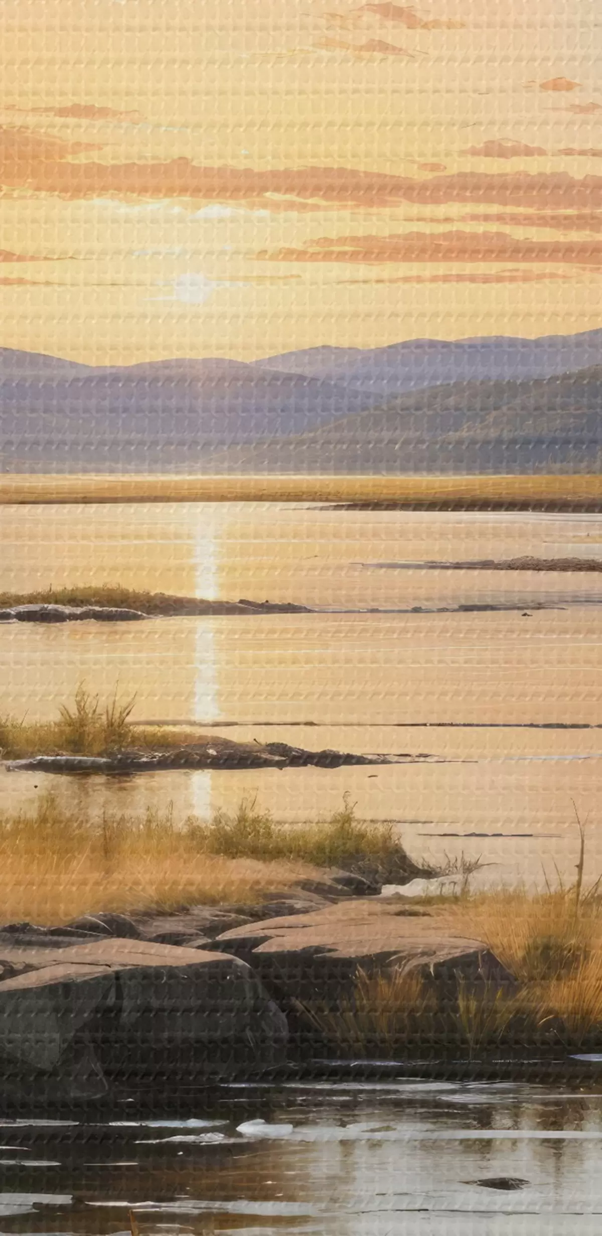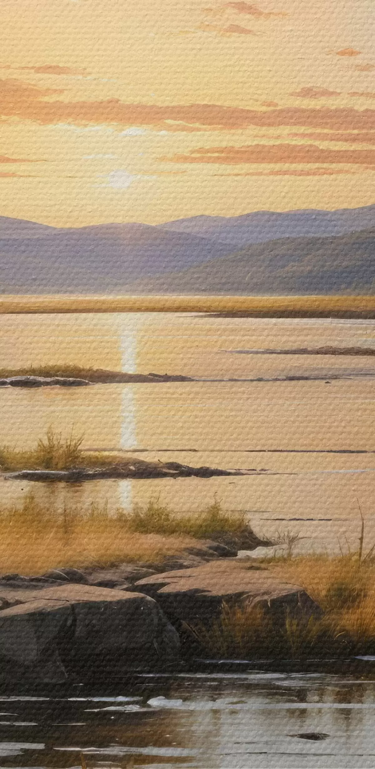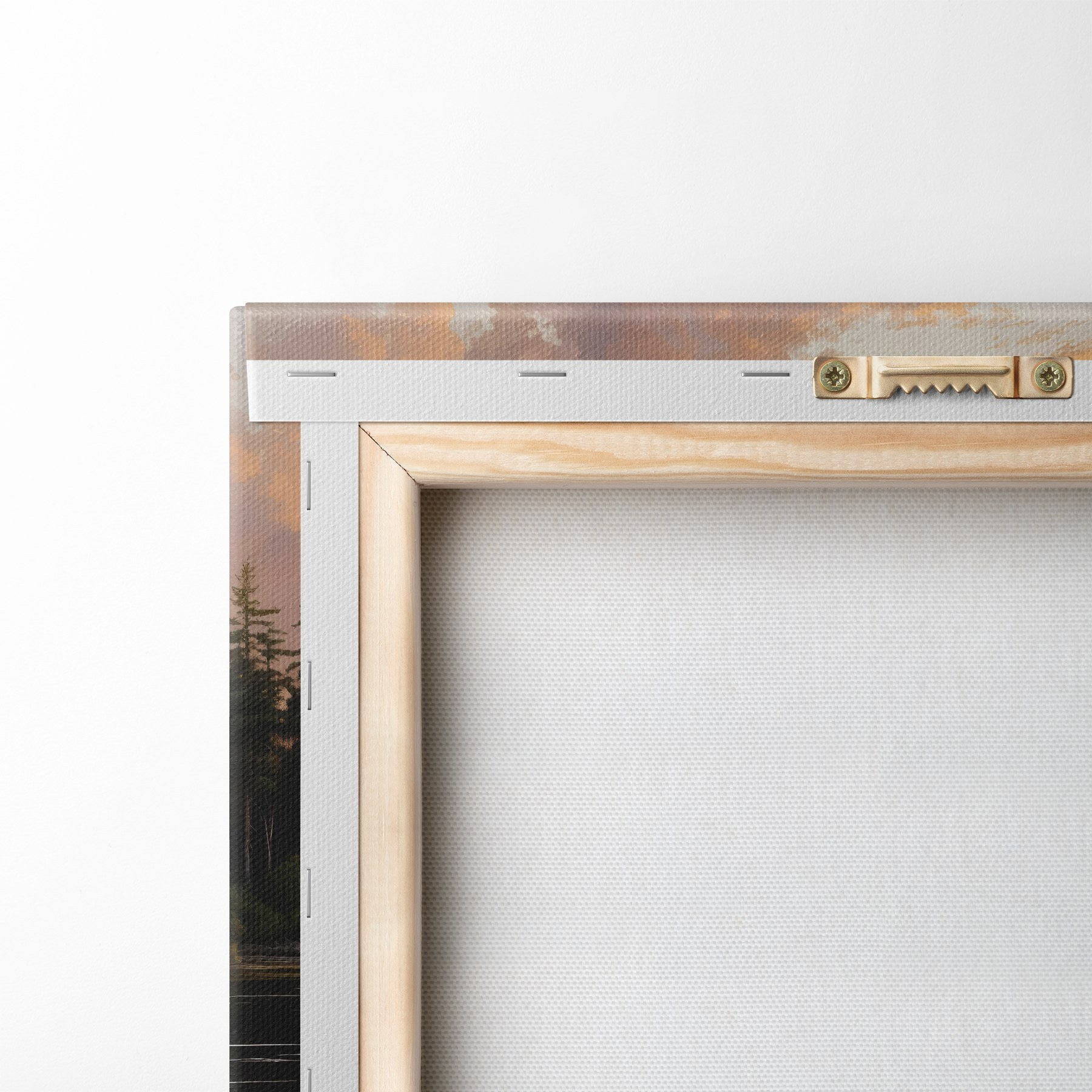 Quadri Un paesaggio sereno con un lago circondato da pini che riflette i colori caldi del cielo al tramonto Nr s41733