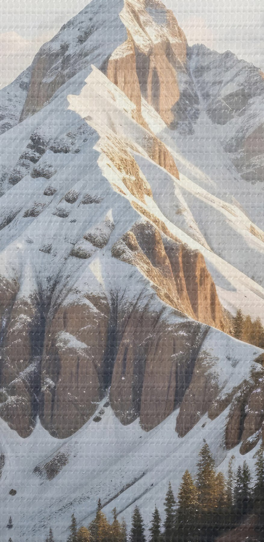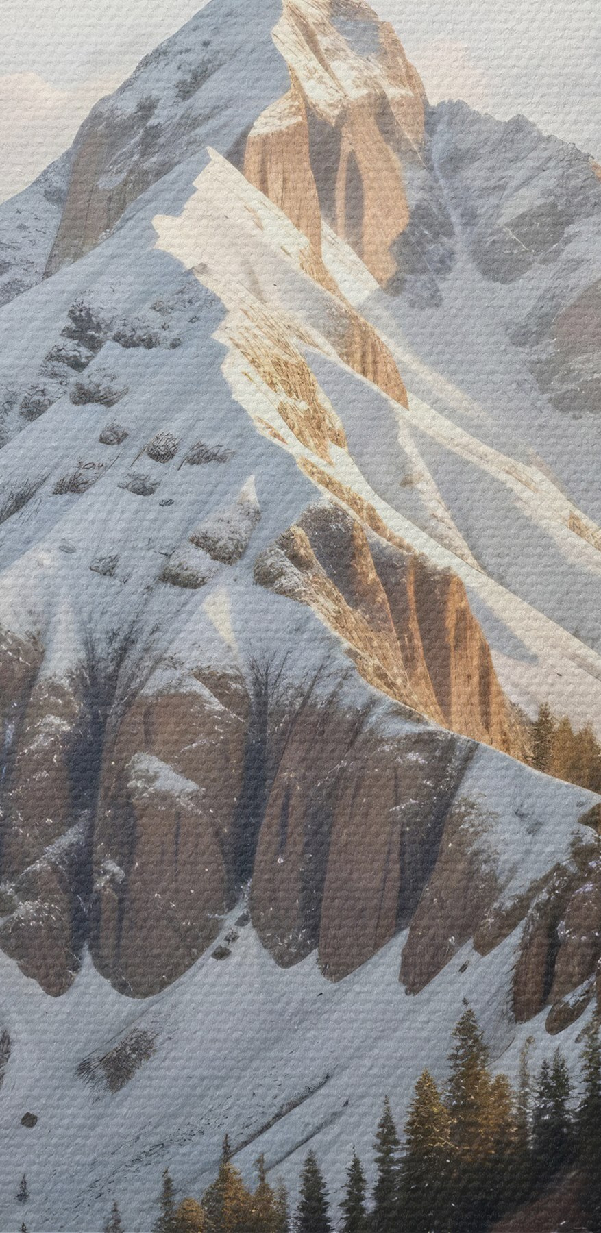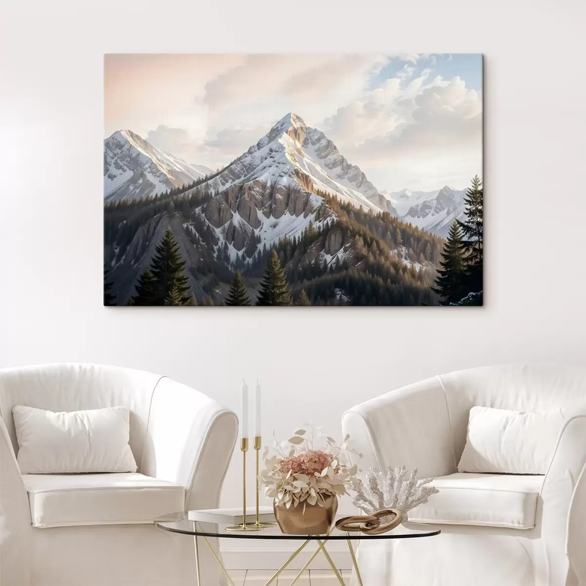 Quadri Una vetta innevata che si staglia su un paesaggio boscoso, con pini in primo piano Nr s41736