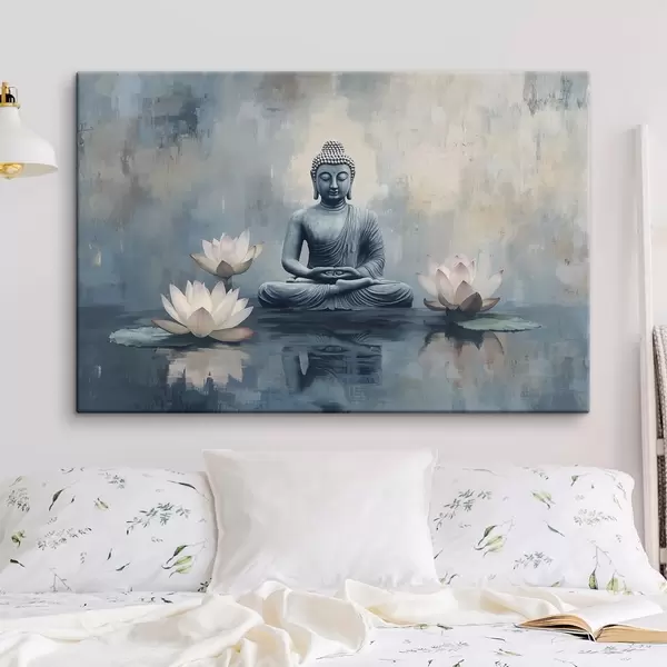 Quadri Buddha in meditazione nel lago con fiori di loto, stile orientale, acrilico Nr s41891