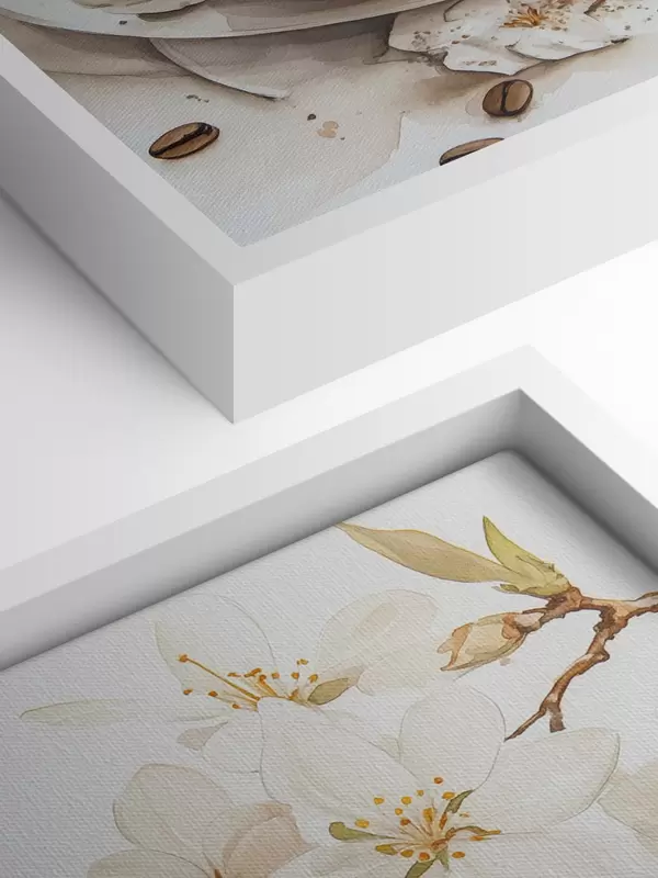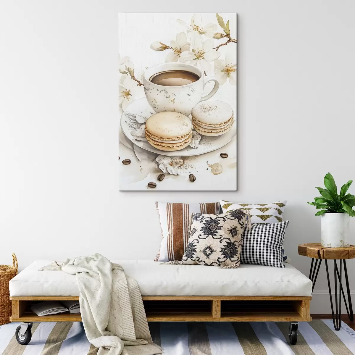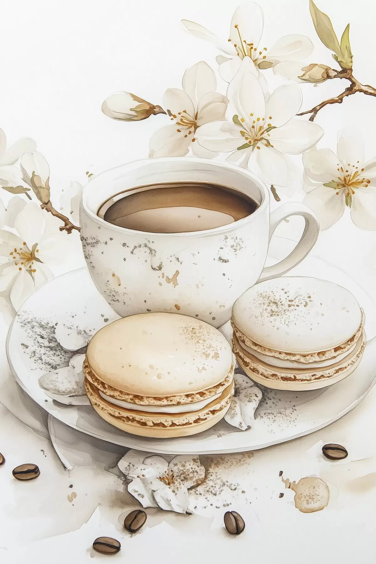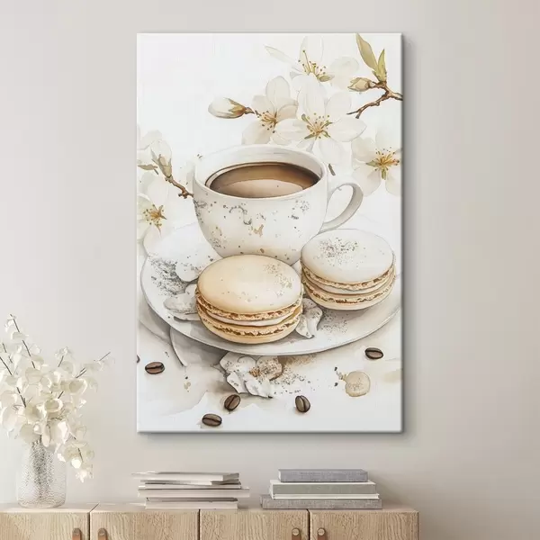 Quadri Tazza di caffè con amaretti, stile acquerello, colori tenui, fiori di gelsomino Nr s41949