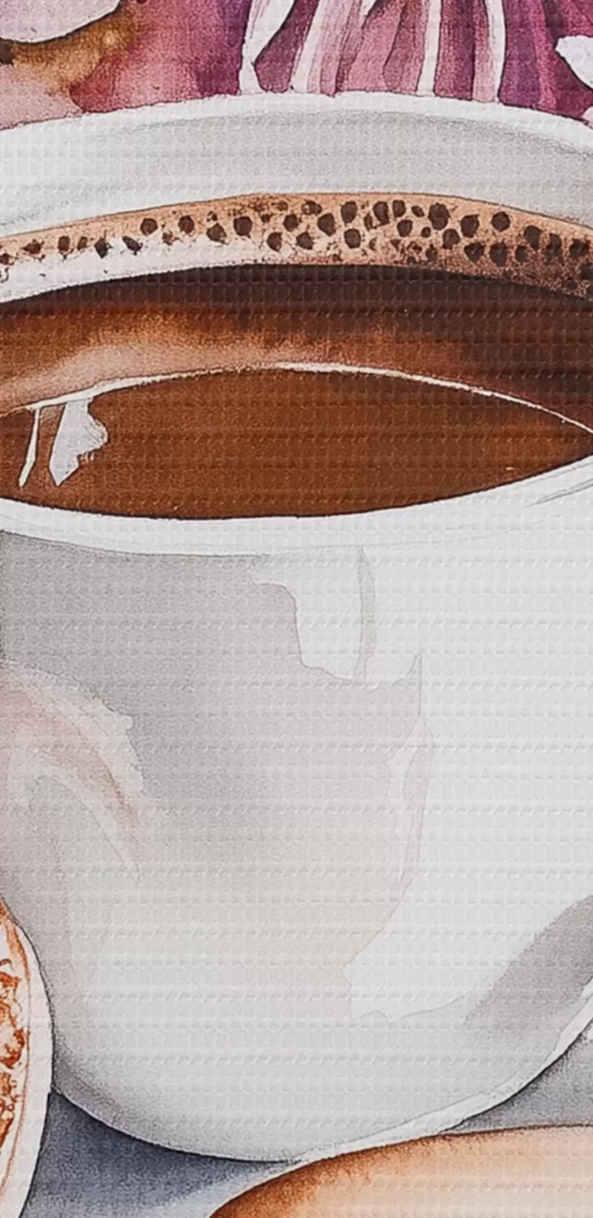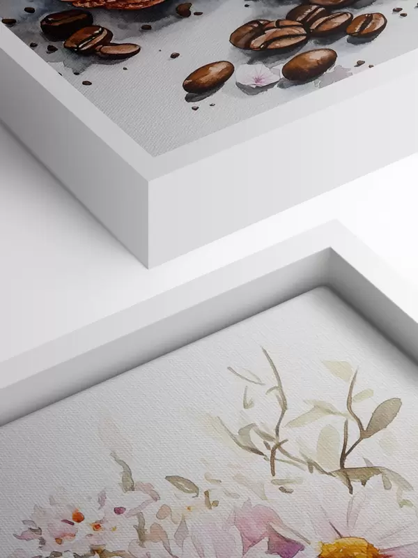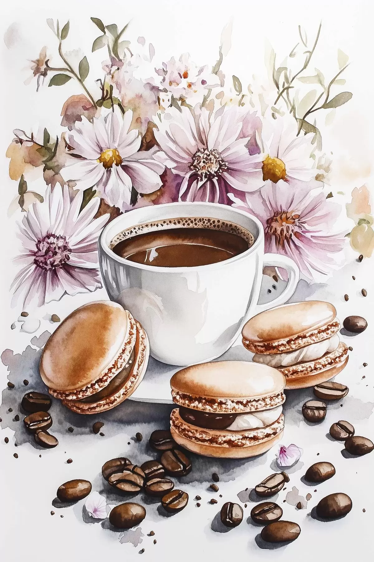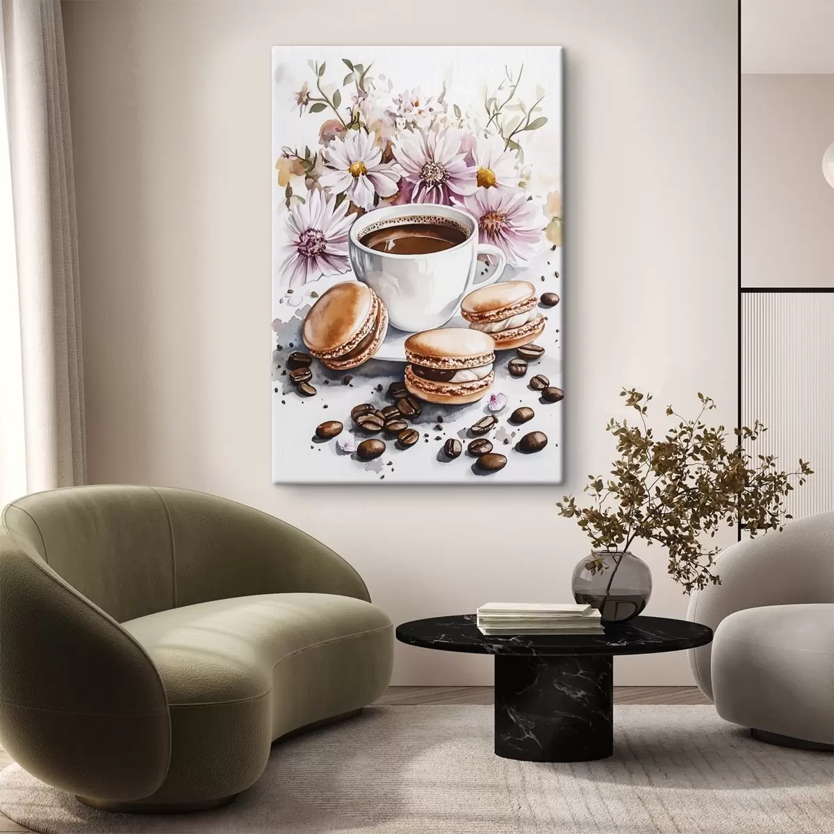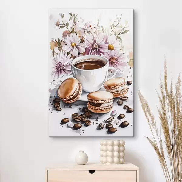 Quadri Tazza di caffè con amaretti, fiori rosa, stile acquerello, chicchi di caffè Nr s41963