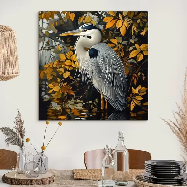 Quadri Un airone in acqua su uno sfondo di foglie autunnali Nr s42041