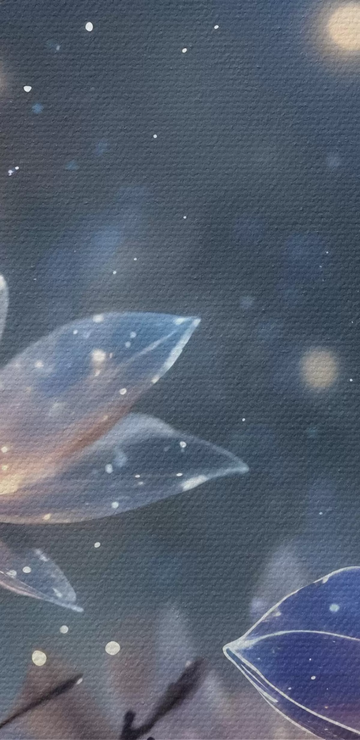 Quadri Fiori astratti di fantasia su rami con petali strutturati con stelle e luna in uno sfondo di cielo notturno Nr s42211