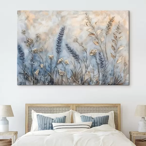 Quadri Un campo di vari fiori selvatici e piante nei toni del blu, del bianco e del beige su uno sfondo morbido e nebuloso Nr s42214