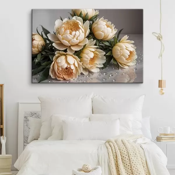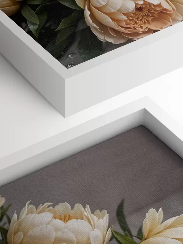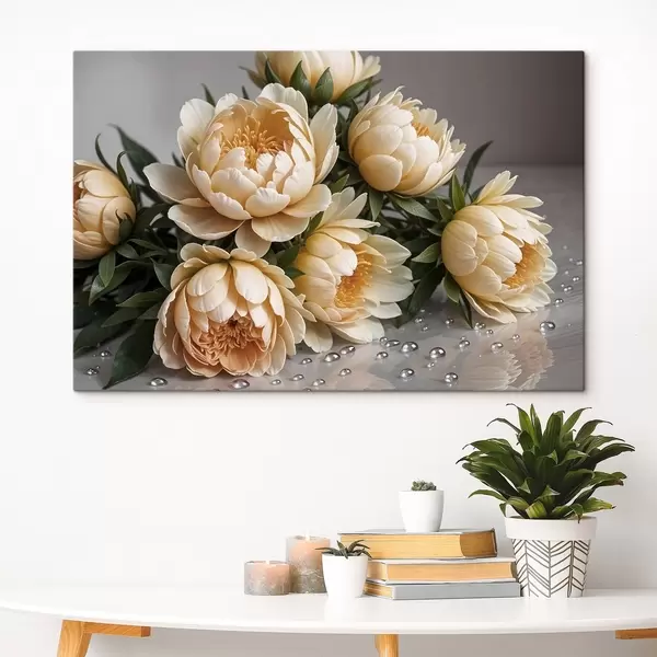 Quadri Fiori di peonia dettagliati color crema con foglie verde scuro su sfondo grigio Nr s42215