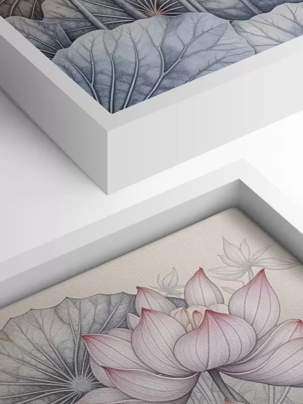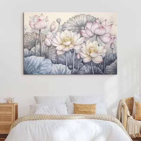 Quadri Grandi fiori di loto rosa e bianchi con foglie e steli verdi su sfondo chiaro con petali e centri dettagliati Nr s42221