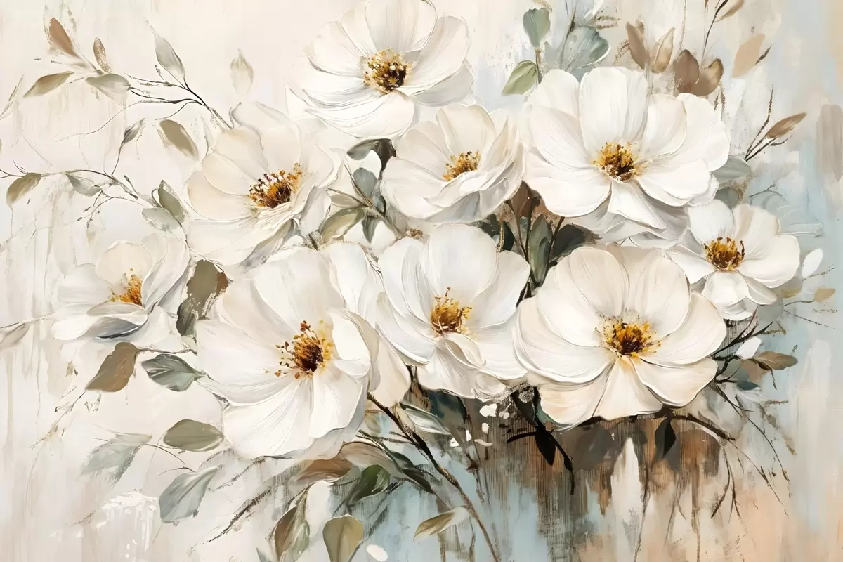 carta da parati Un bouquet di grandi fiori bianchi in stile pittura a olio con centri gialli su uno sfondo chiaro  nr. s42222