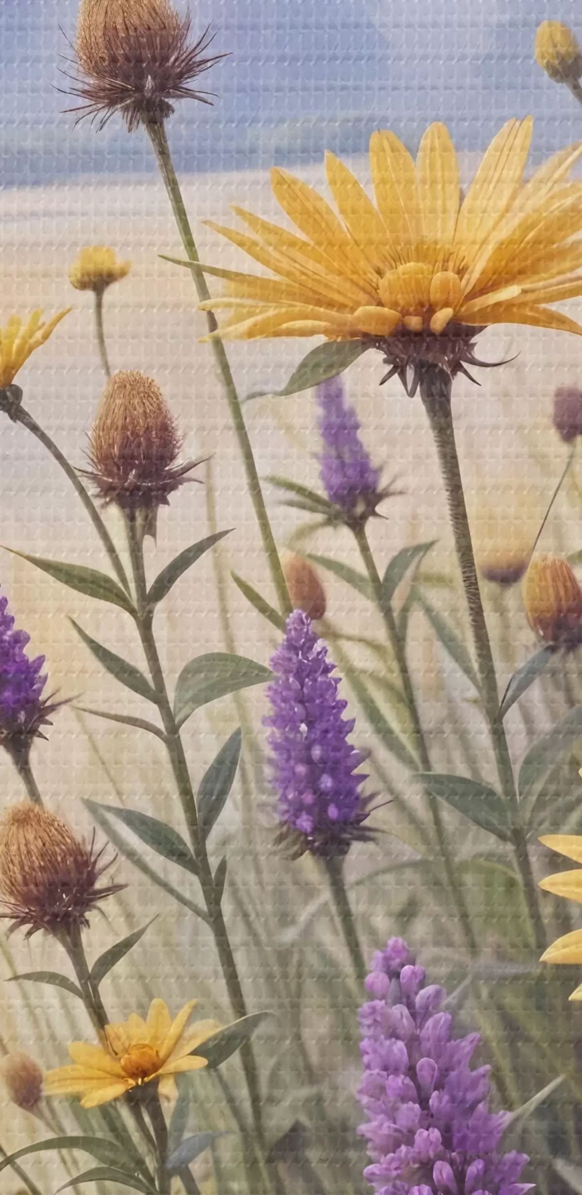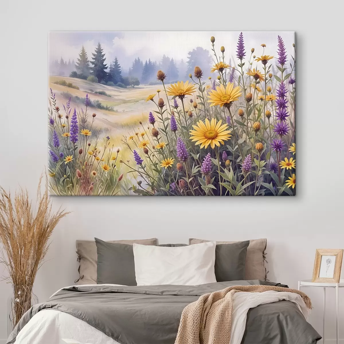 Quadri Un campo di girasoli gialli e fiori di campo viola in un paesaggio forestale nebbioso con pini sullo sfondo Nr s42223