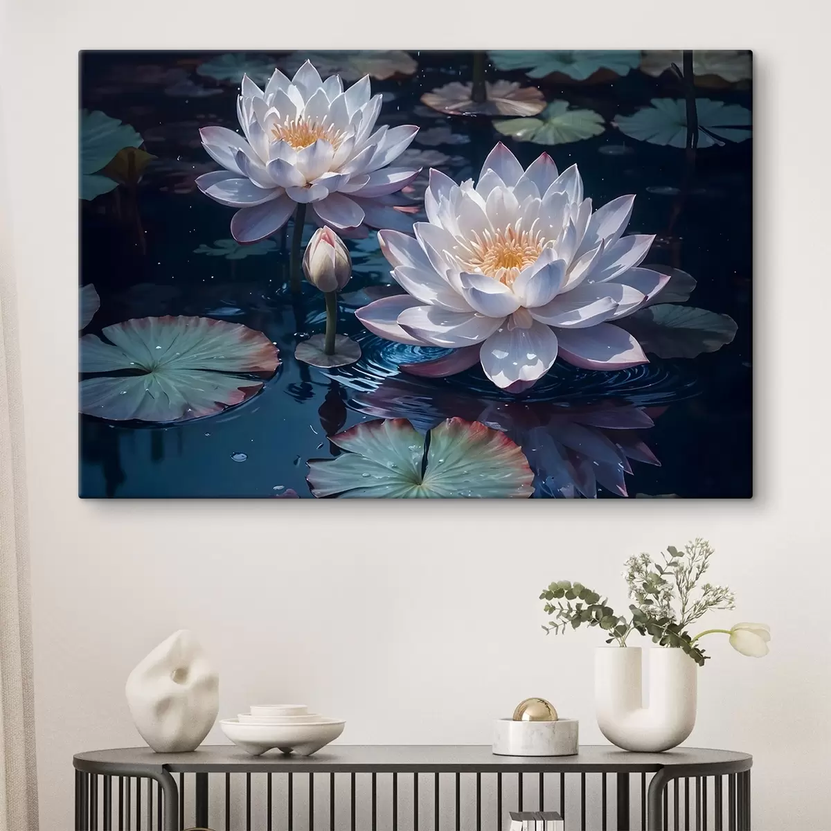 Quadri Fiori di loto bianchi che galleggiano su uno stagno tranquillo con ninfee Nr s42225
