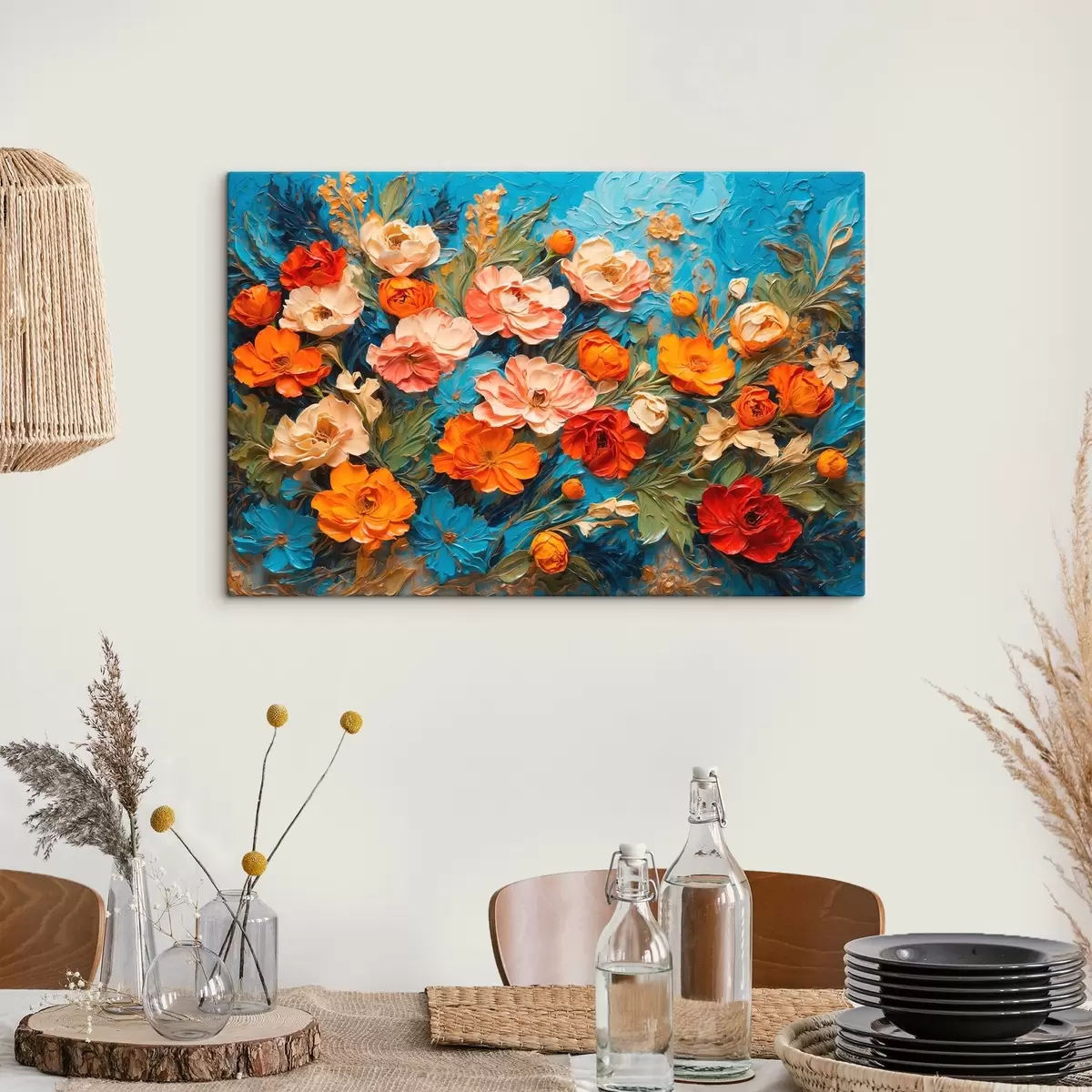 Quadri Vari fiori su sfondo blu astratto in stile pittura ad olio Nr s42269