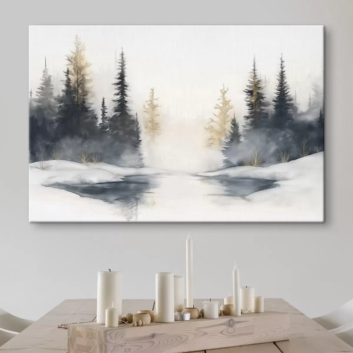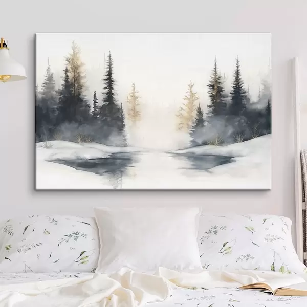 Quadri Paesaggio invernale con fiume e pini, natura, foresta, nebbia Nr s42374