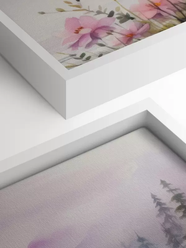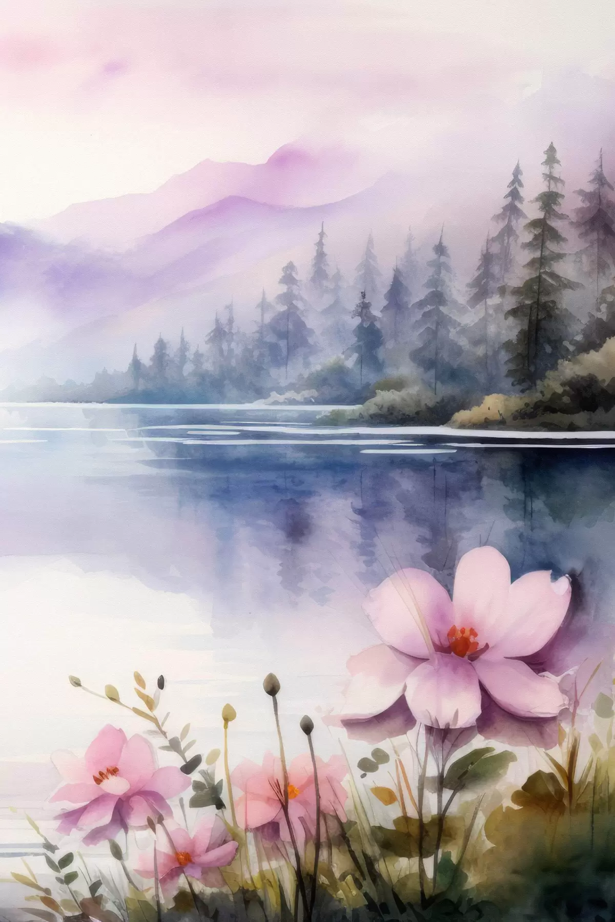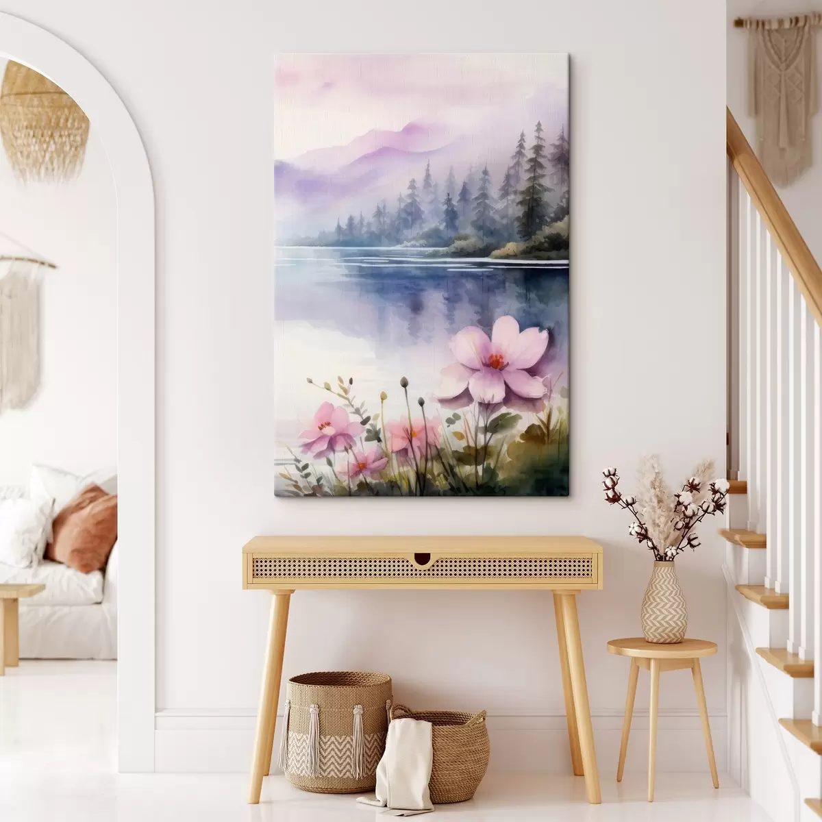 Quadri Fiori rosa sullo sfondo di un lago in montagna Nr s42393