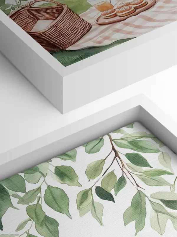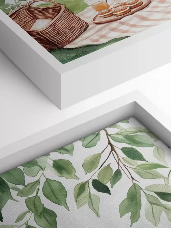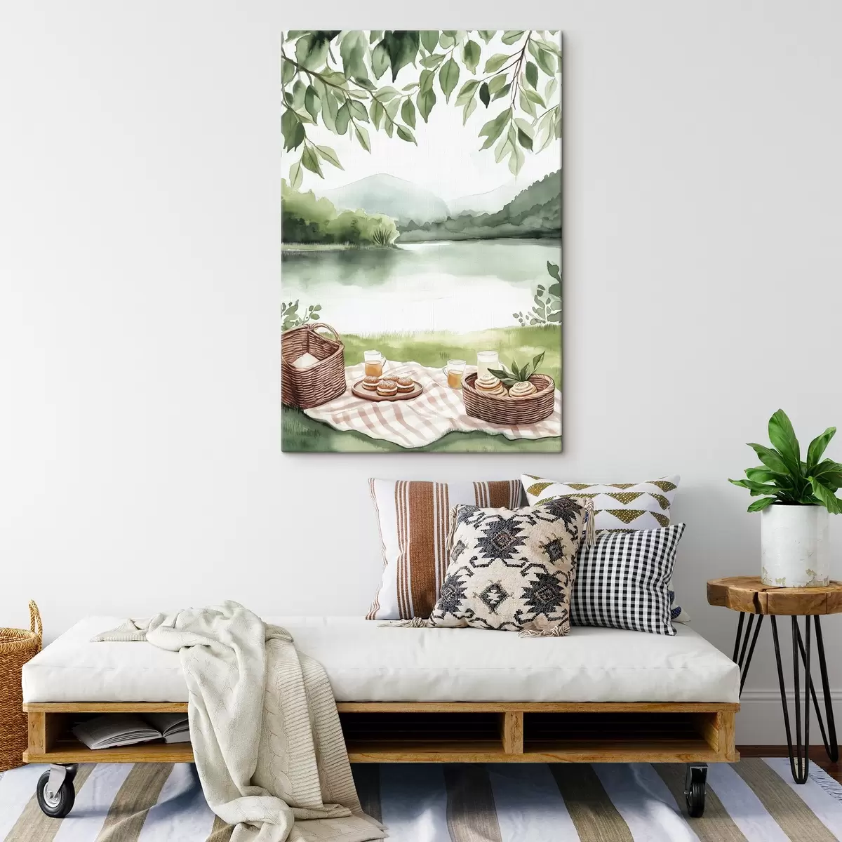 Quadri Picnic estivo in stile acquerello, rustico, lago, verde, cesti di cibo Nr s42452