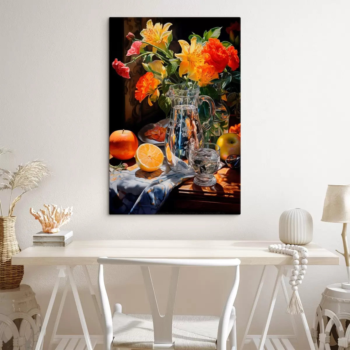 Quadri Una natura morta con un bouquet di fiori vivaci nei toni del giallo e del rosso, una brocca di vetro, agrumi e mele su un tavolo illuminato. Nr s42560