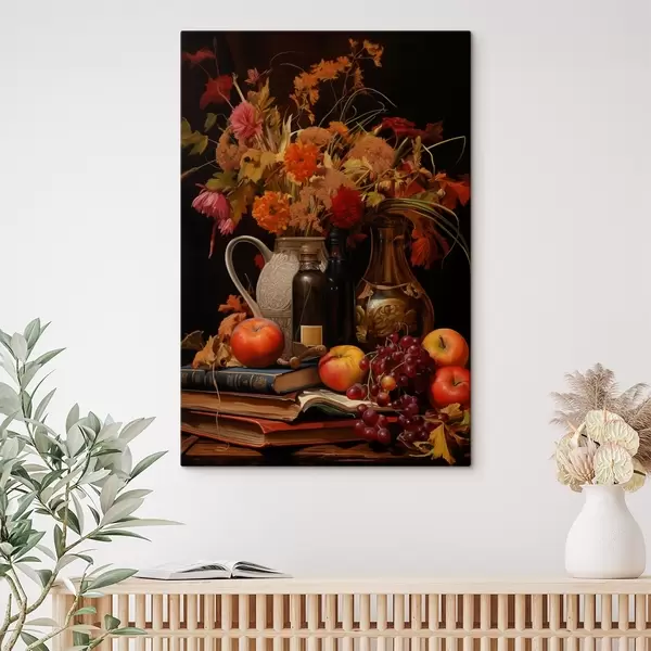 Quadri Una natura morta autunnale con un bouquet dai toni caldi dell'arancio e del rosso, mele, uva, libri e piatti di ceramica su uno sfondo scuro Nr s42561