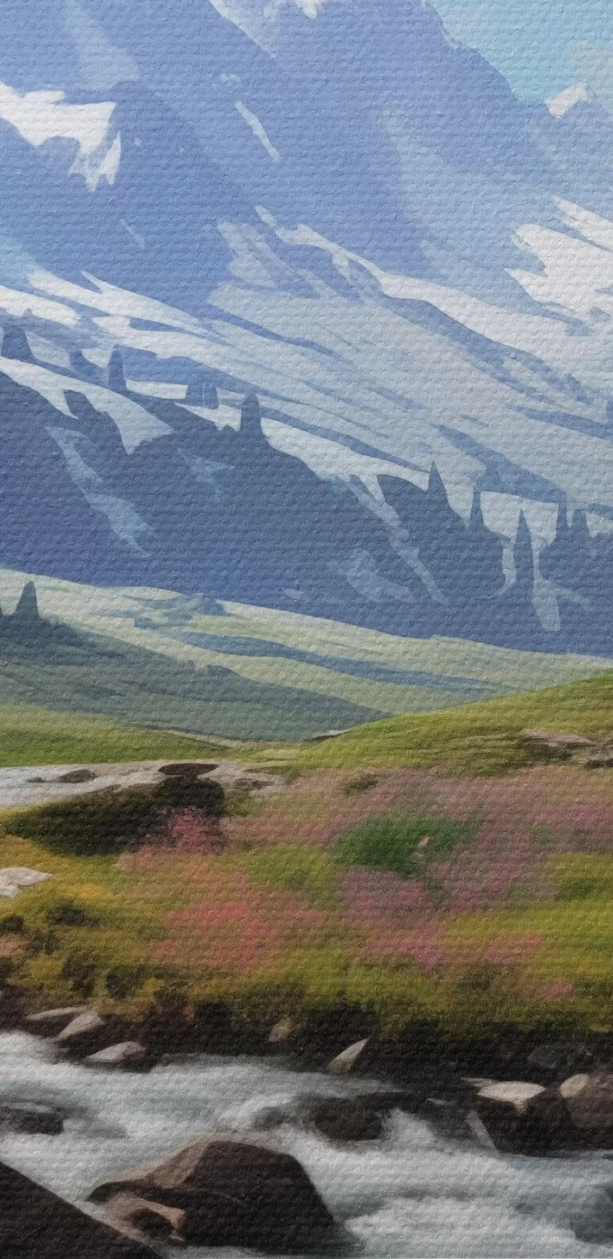 Quadri Un paesaggio montano con un ruscello impetuoso, prati in fiore e cime innevate all'orizzonte sotto un cielo blu brillante. Nr s42563