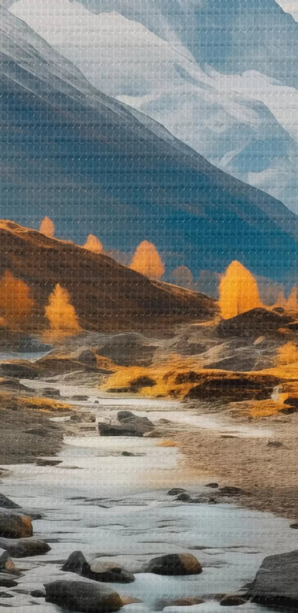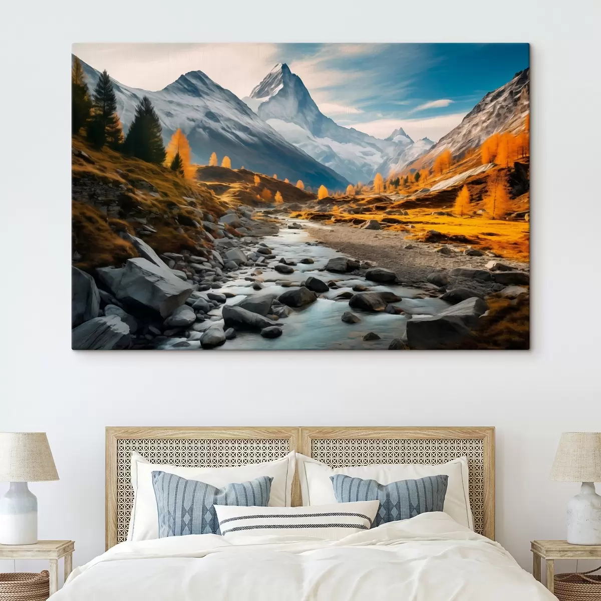 Quadri Paesaggio montano autunnale con un fiume impetuoso, alberi e una maestosa vetta sullo sfondo di un cielo limpido. Nr s42564