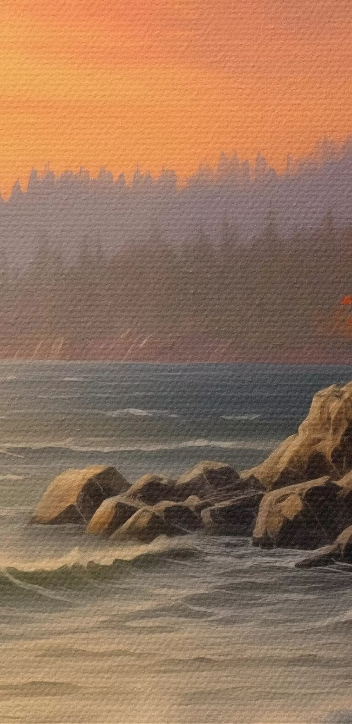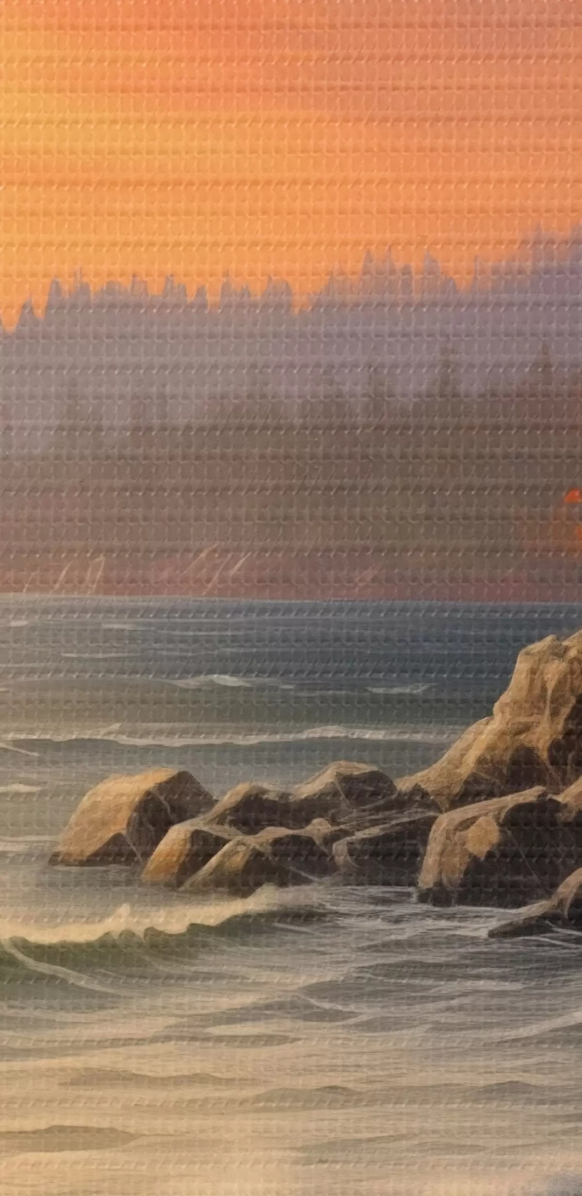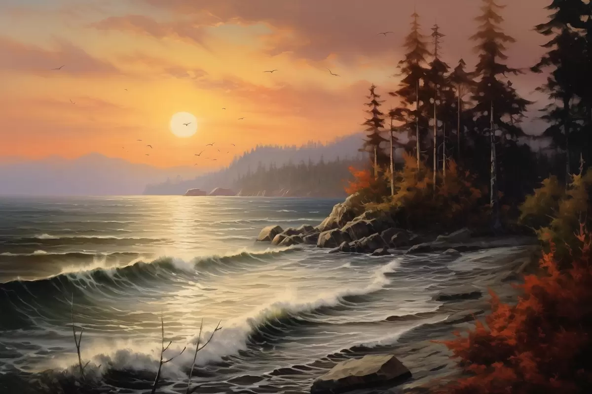 carta da parati Tramonto sul mare con onde, pineta e colori autunnali in primo piano. nr. s42571