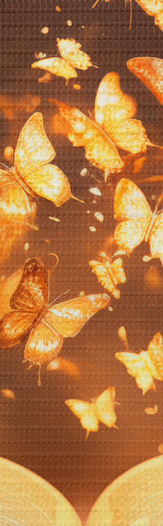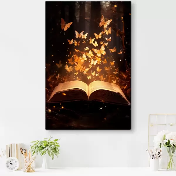 Quadri Un libro aperto da cui emergono farfalle luminose che brillano in raggi di luce in una foresta buia e magica. Nr s42573