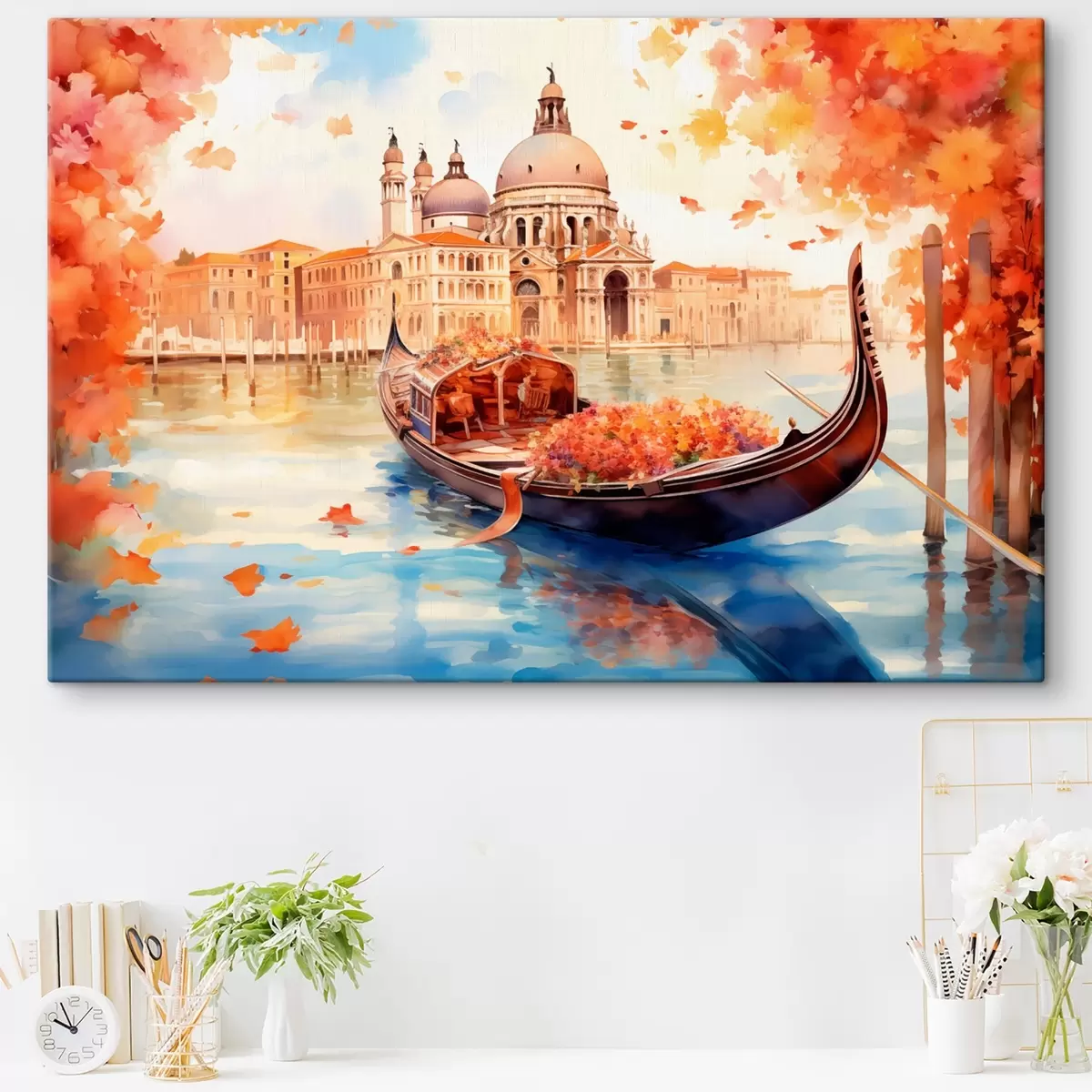 Quadri Una veduta autunnale di Venezia con una gondola circondata da foglie arancioni e rosse, con i riflessi degli edifici nell'acqua calma del canale. Nr s42576