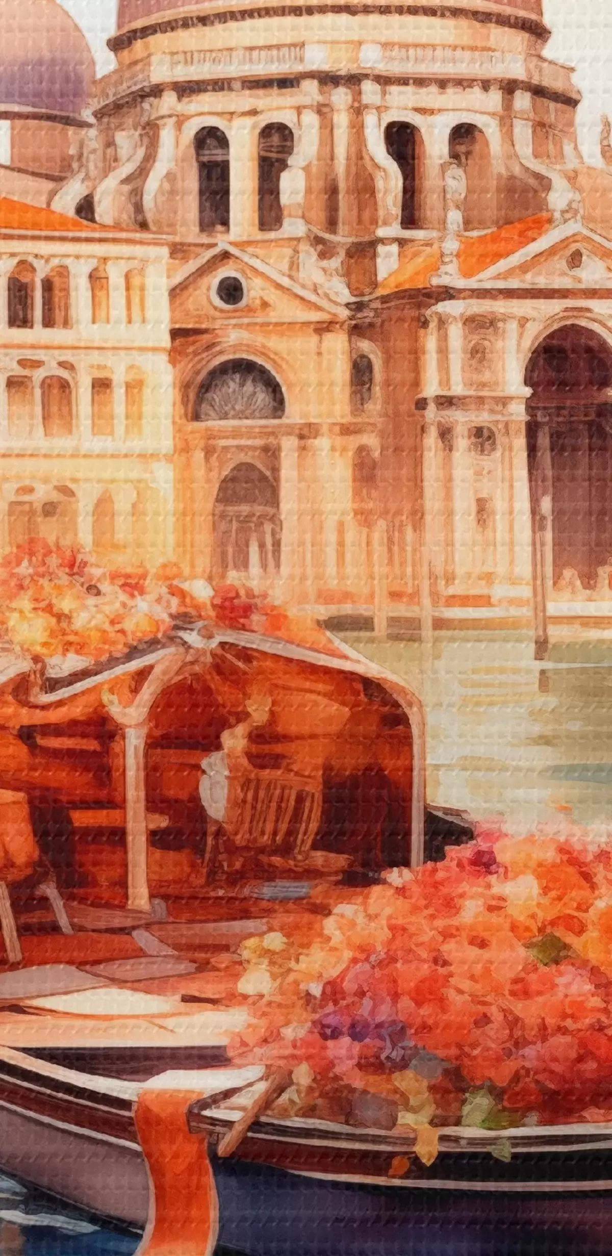 carta da parati Una veduta autunnale di Venezia con una gondola circondata da foglie arancioni e rosse, con i riflessi degli edifici nell'acqua calma del canale. nr. s42576