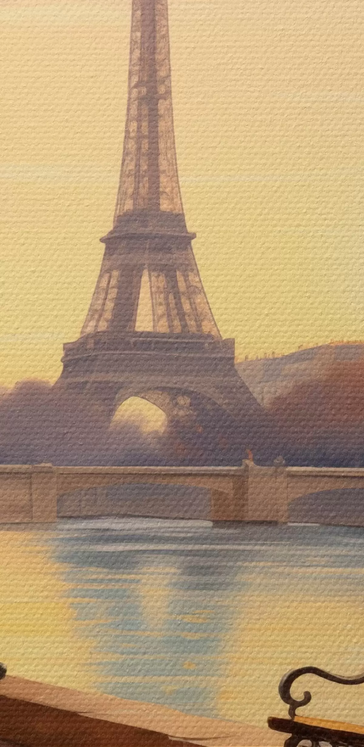 Quadri Autunno a Parigi con vista sulla Torre Eiffel, il lungofiume della Senna ricoperto di foglie, panchine e lampioni che aggiungono un tocco romantico all'atmosfera. Nr s42577