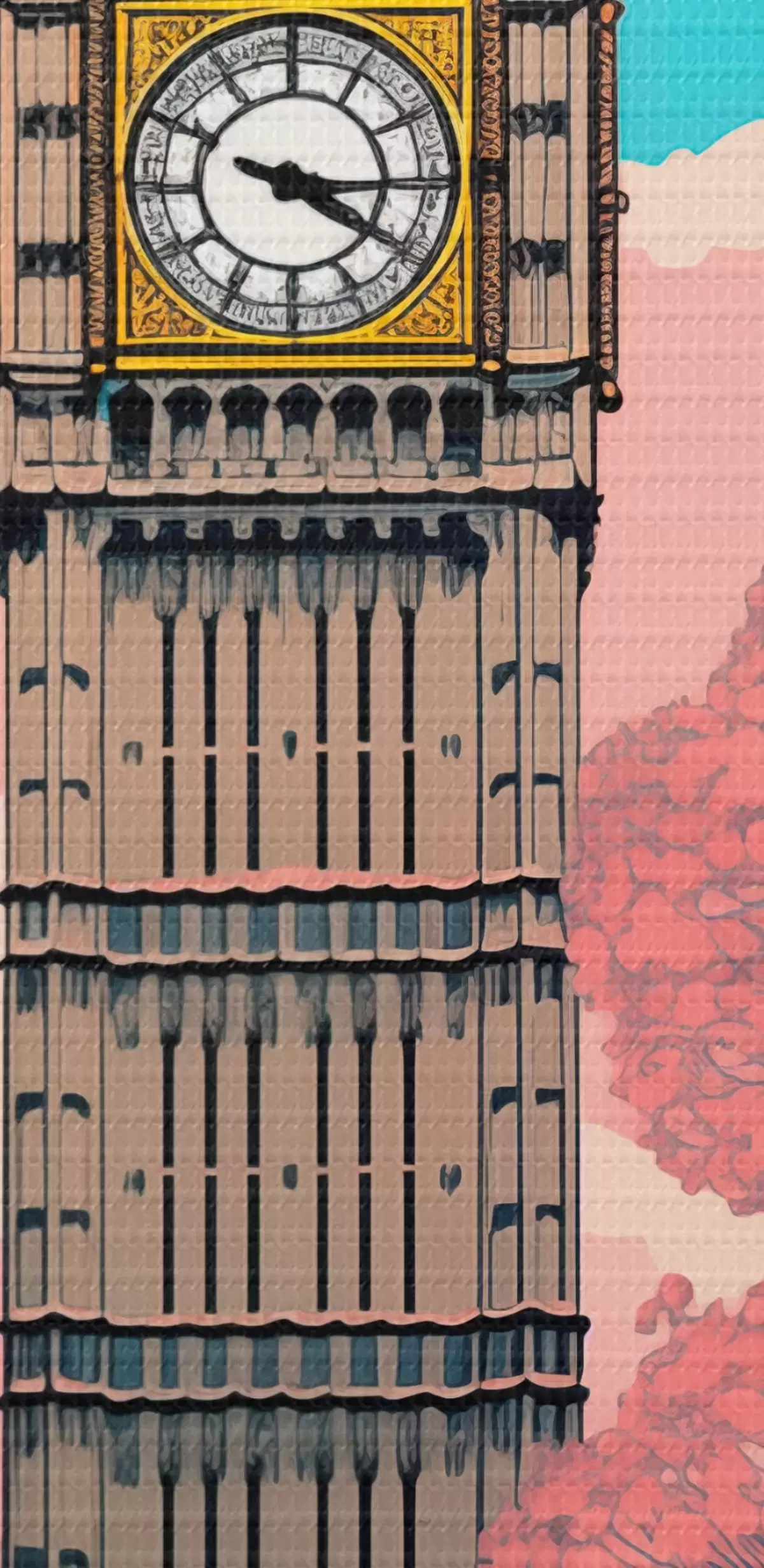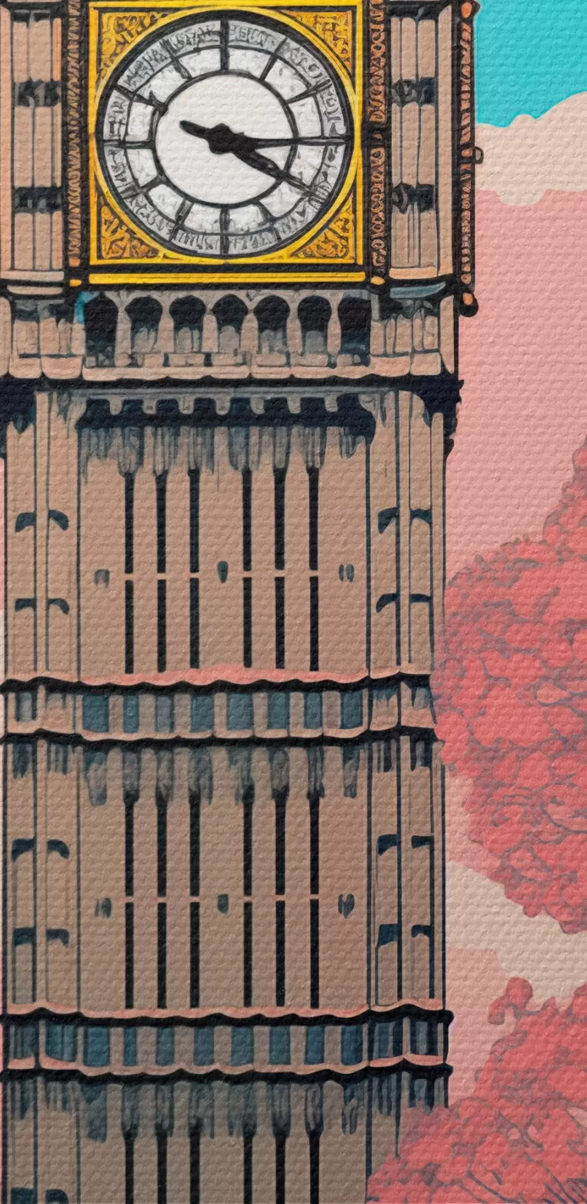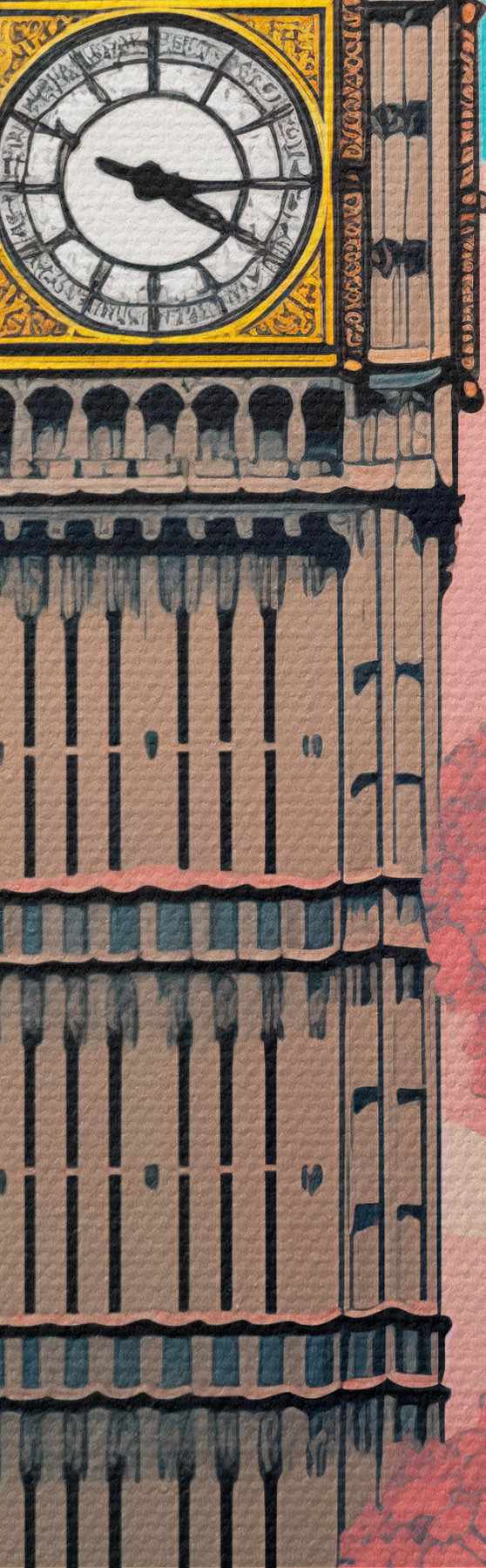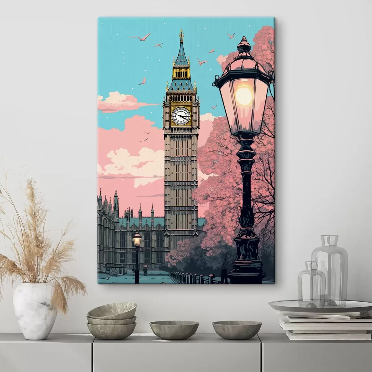 Quadri Una vista del Big Ben con alberi rosa primaverili, un cielo blu brillante e un lampione vintage in primo piano. Nr s42578
