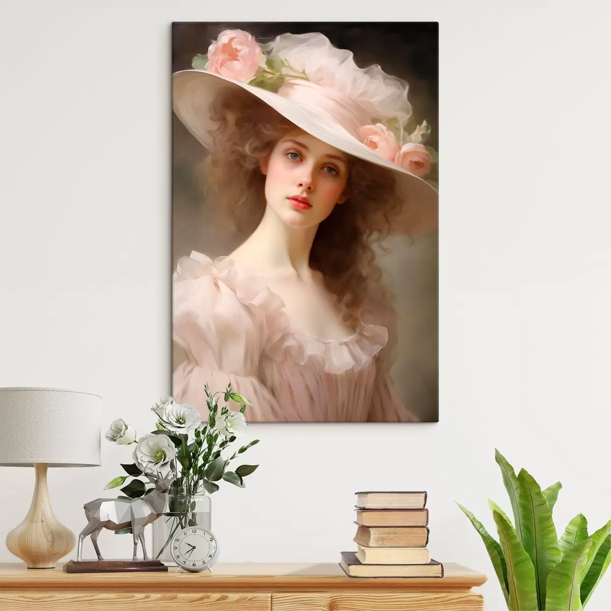 Quadri Ritratto di una giovane donna con un delicato abito rosa e un cappello ornato di fiori, dall'espressione romantica e raffinata. Nr s42581