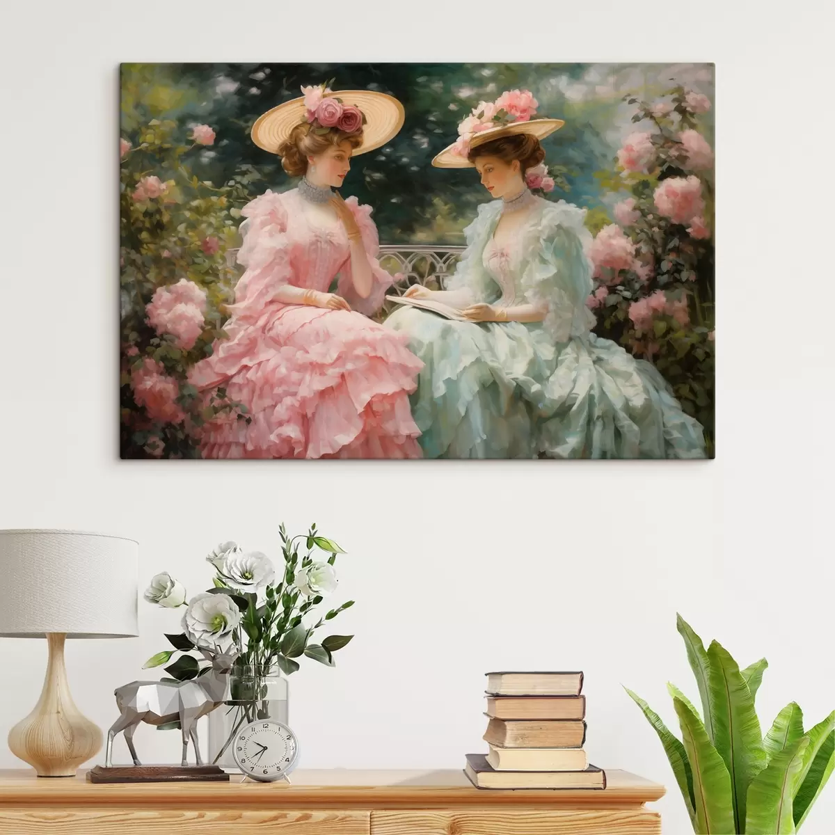 Quadri Due donne eleganti in abiti pastello sedute in un giardino tra le rose, leggono un libro e si godono un'atmosfera tranquilla. Nr s42582
