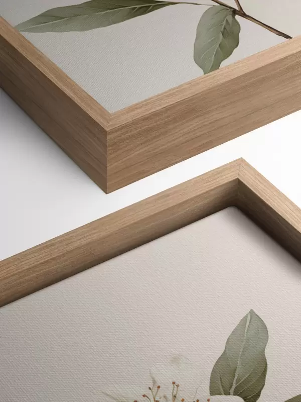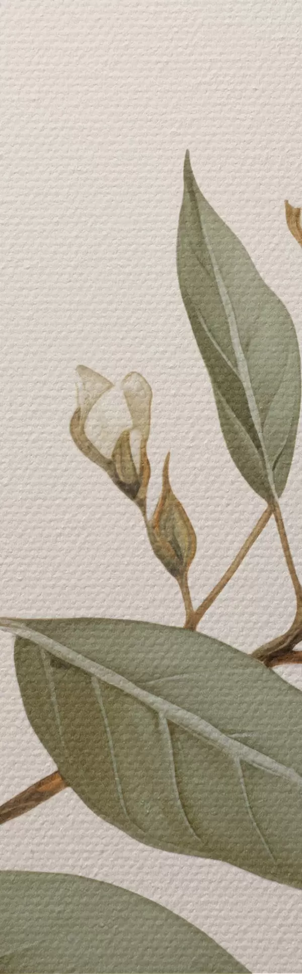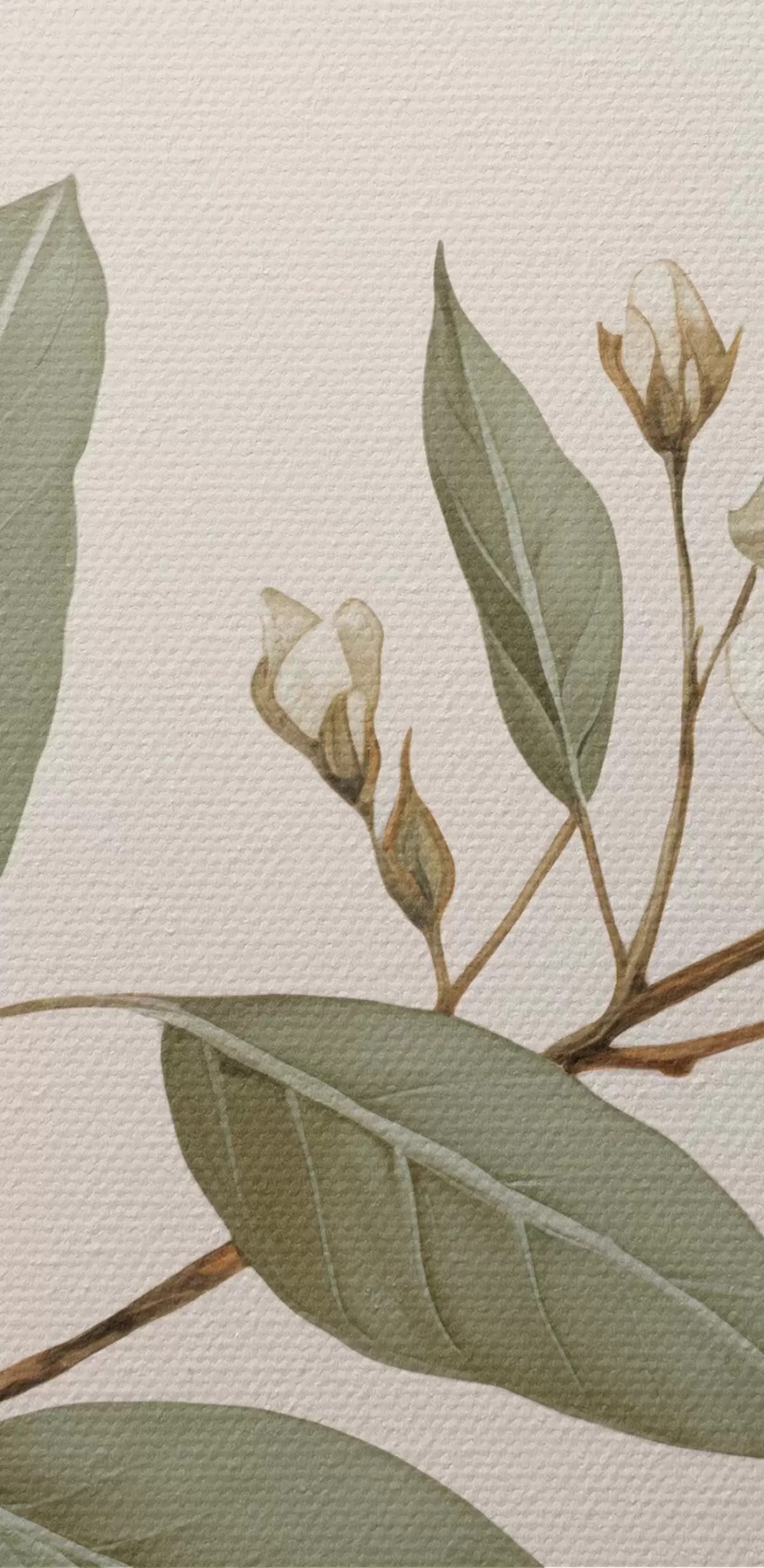 Quadri Un ramo delicato con fiori bianchi e foglie verdi su uno sfondo chiaro, con dettagli morbidi e uno stile elegante. Nr s42583