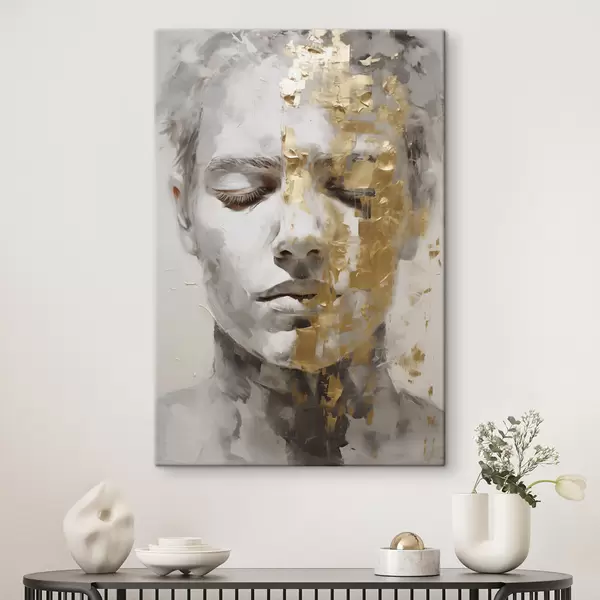 carta da parati Un ritratto astratto con occhi chiusi, reso in toni chiari con pennellate contrastanti di colori caldi che creano un'atmosfera profonda e meditativa. nr. s42624