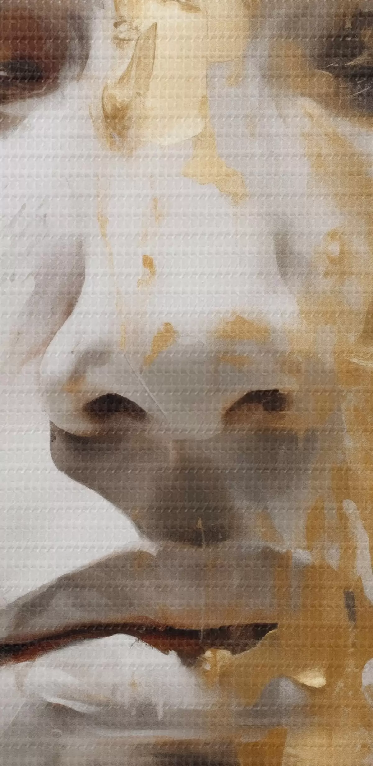Quadri Un ritratto astratto con occhi chiusi, reso in toni chiari con pennellate contrastanti di colori caldi che creano un'atmosfera profonda e meditativa. Nr s42624