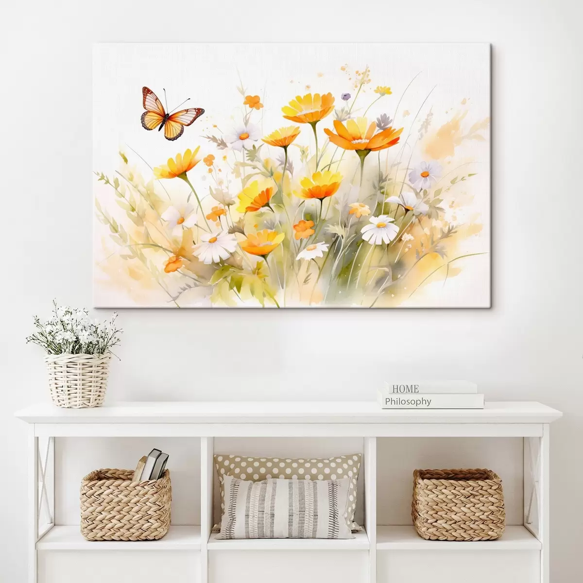 Quadri Un vivace campo di fiori ad acquerello con margherite bianche e arancioni e una farfalla che svolazza nelle vicinanze Nr s42714