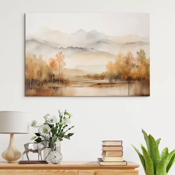 Quadri Paesaggio caratterizzato da morbide montagne con un lago calmo che riflette lo scenario e alberi con fogliame arancione Nr s42716