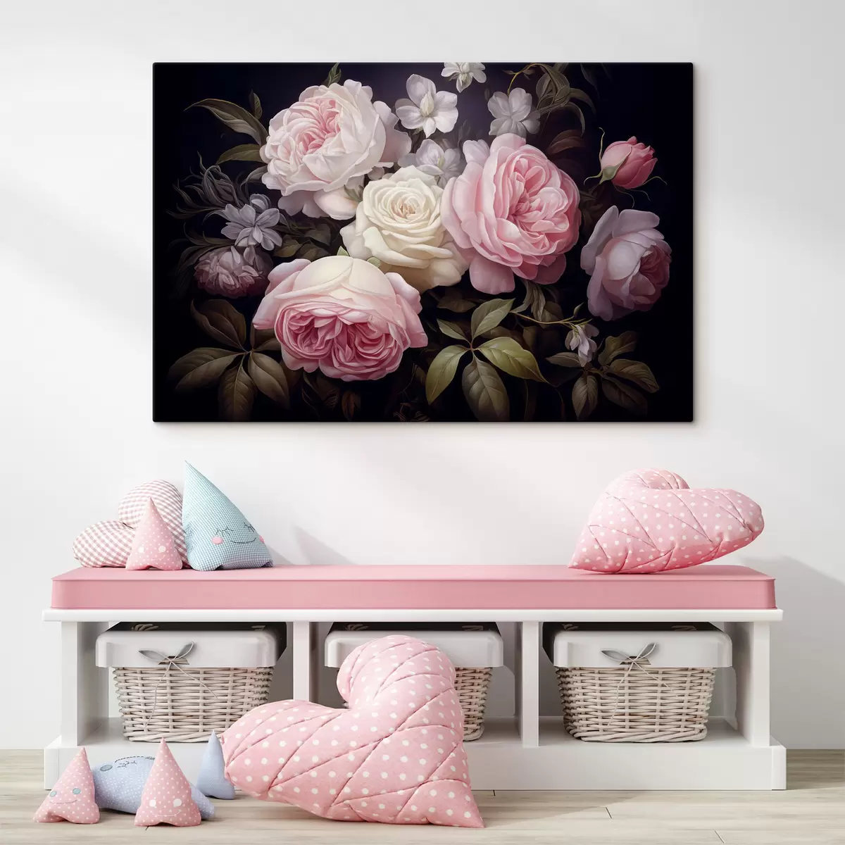 Quadri Rose rosa e bianche disposte con delicati fiori bianchi e foglie verdi su uno sfondo scuro Nr s42721