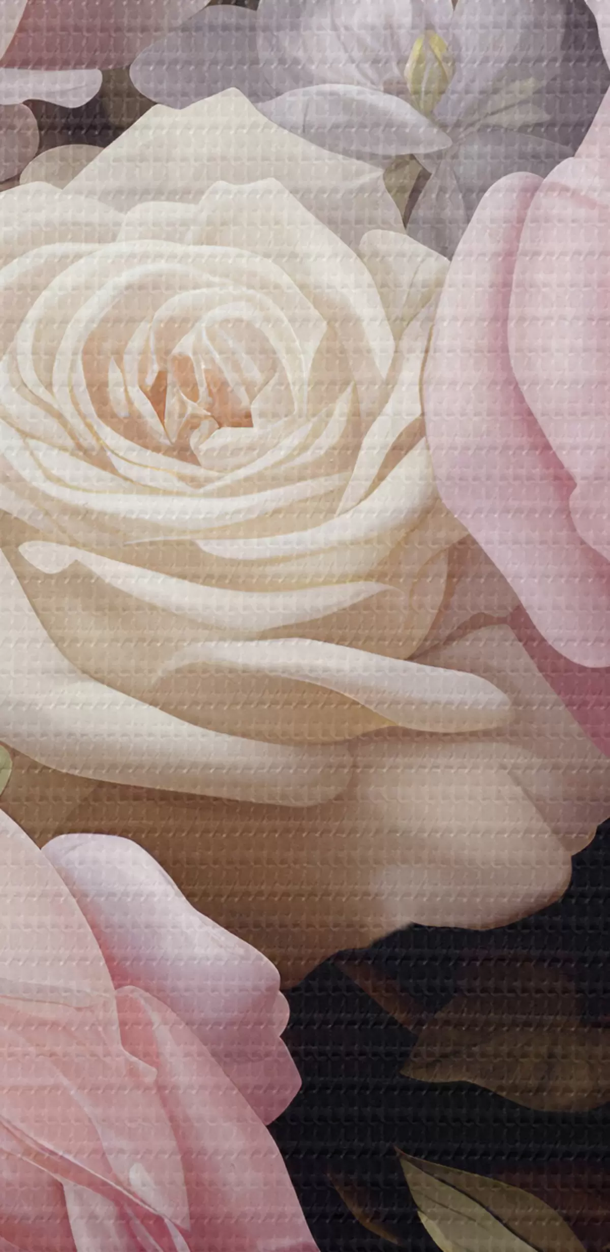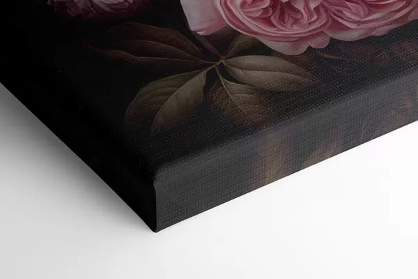 Quadri Rose rosa e bianche disposte con delicati fiori bianchi e foglie verdi su uno sfondo scuro Nr s42721