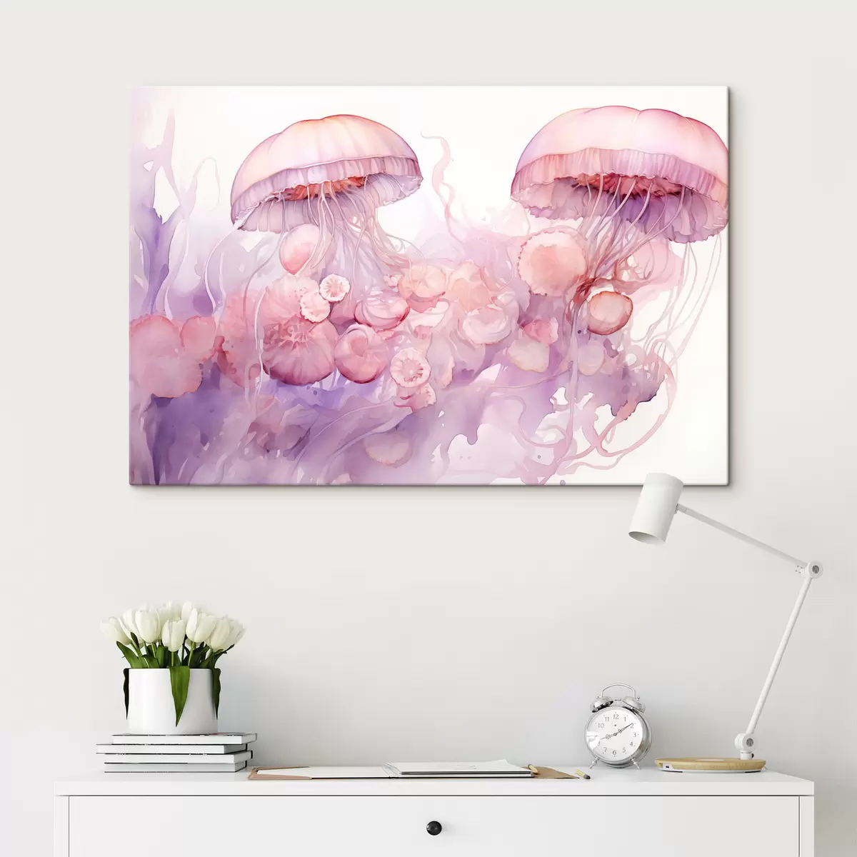 Quadri Meduse rosa che fluttuano in un turbinio di colori rosa e viola, circondate da forme astratte Nr s42730