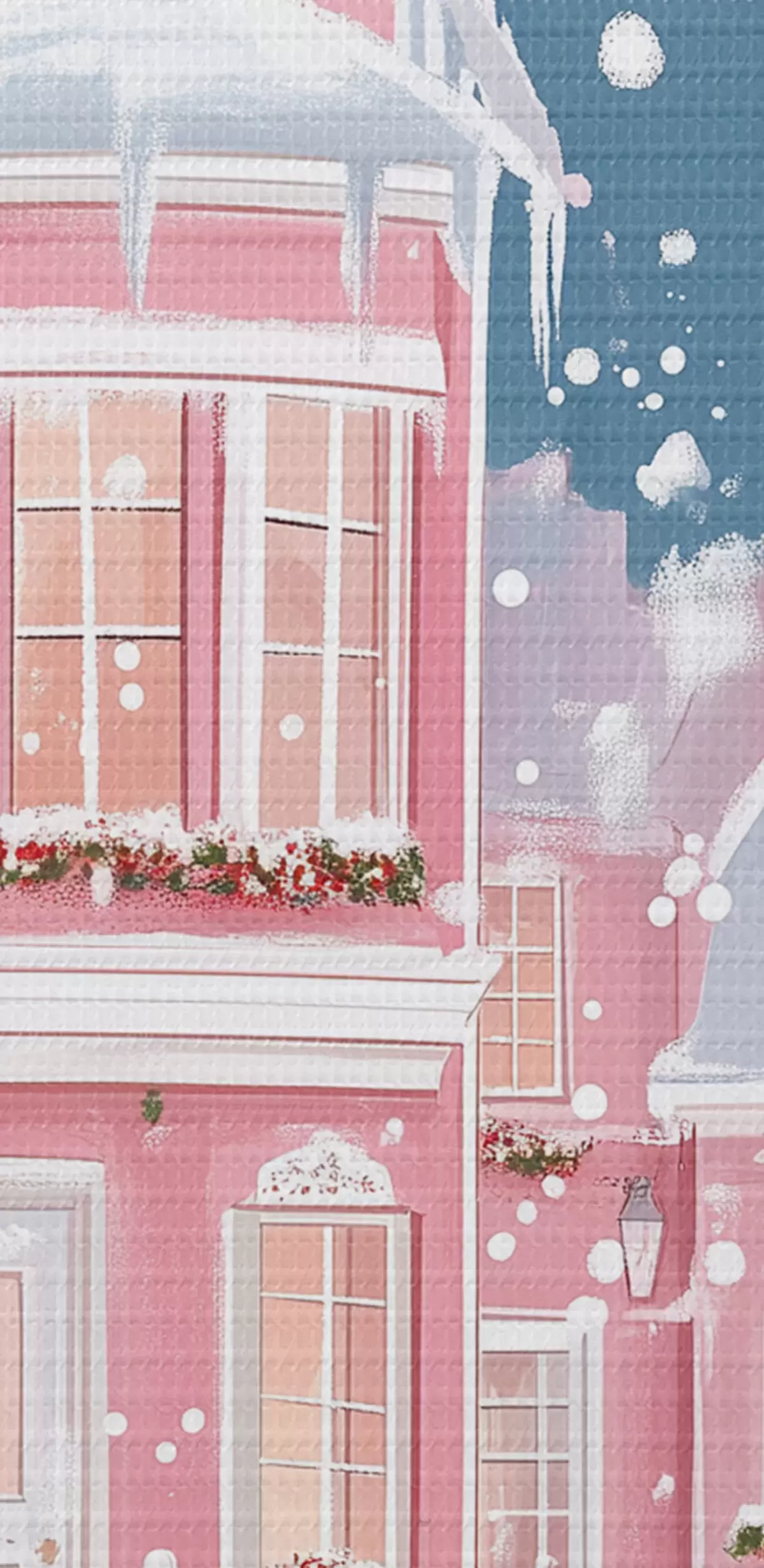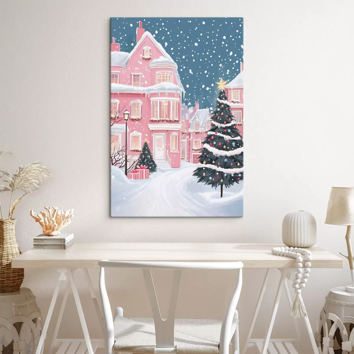 Quadri Città invernale con case rosa, alberi di Natale e fiocchi di neve Nr s42792