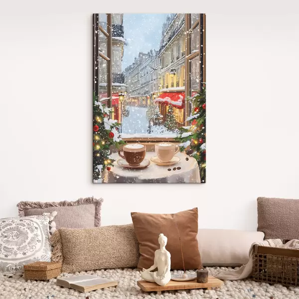 Quadri Accogliente caffè invernale, tazze di caffè, stile acrilico, architettura della città vecchia Nr s42795