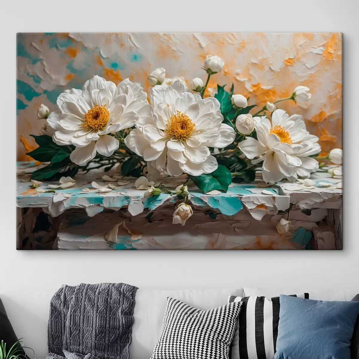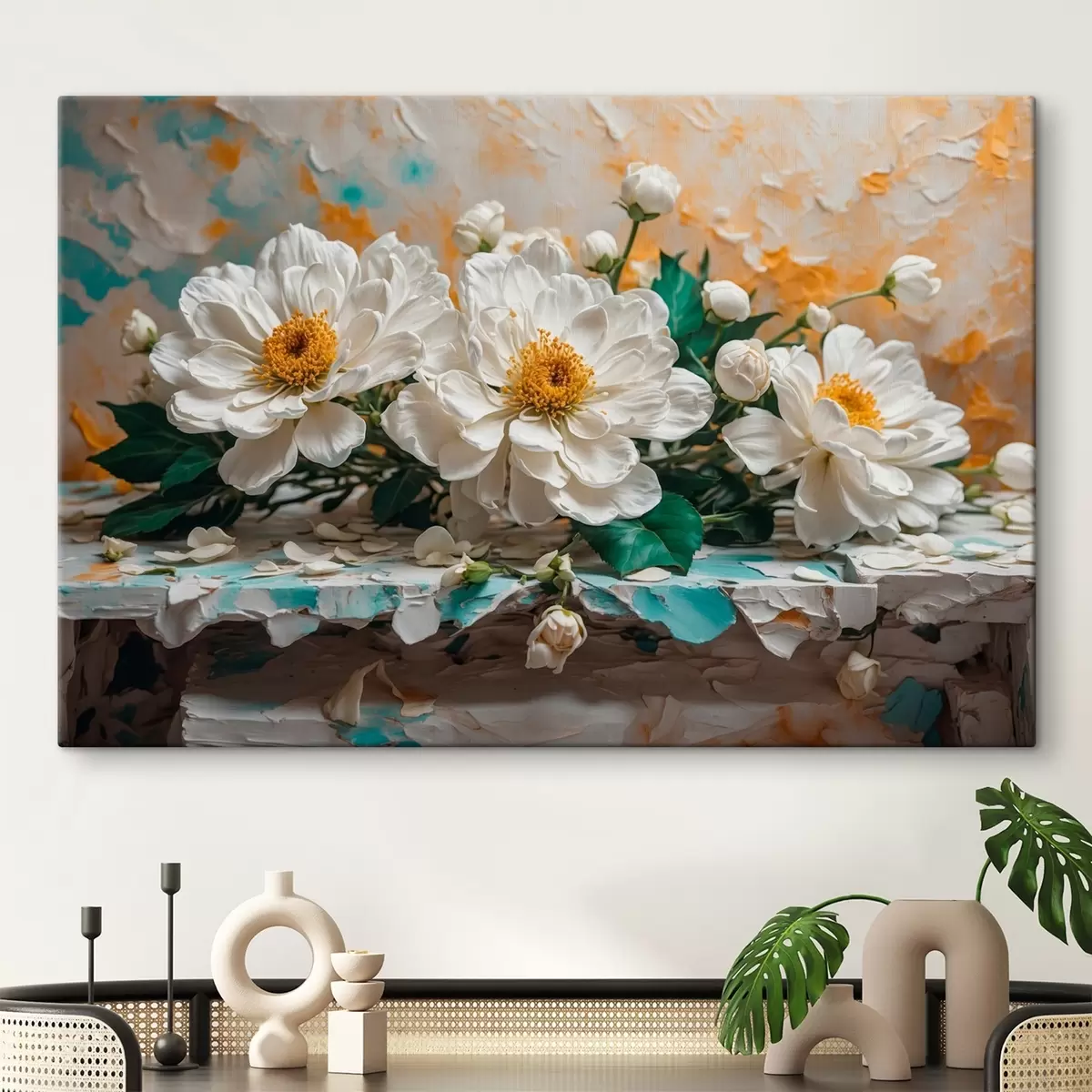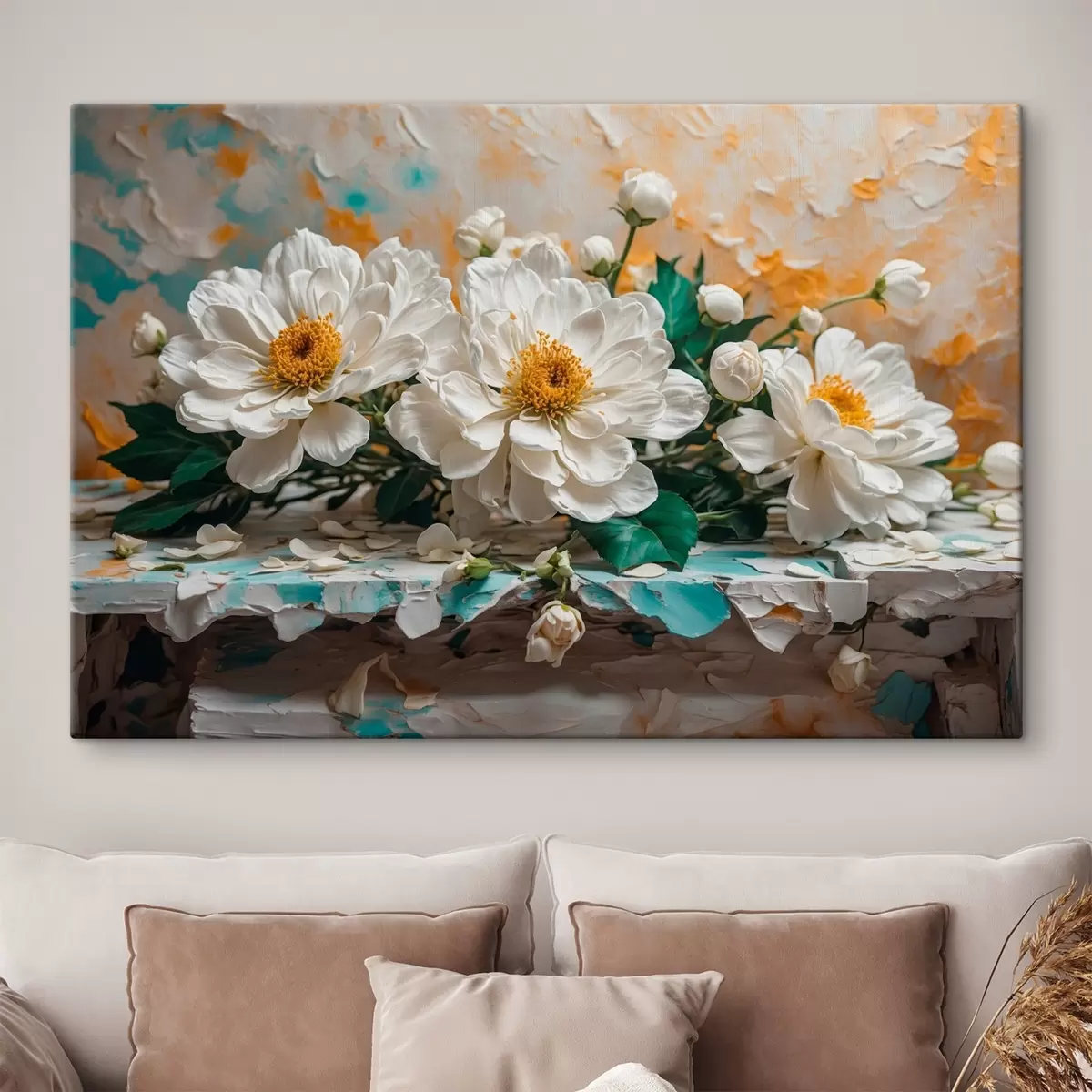 Quadri Fiori bianchi su un tavolo su sfondo astratto Nr s42924