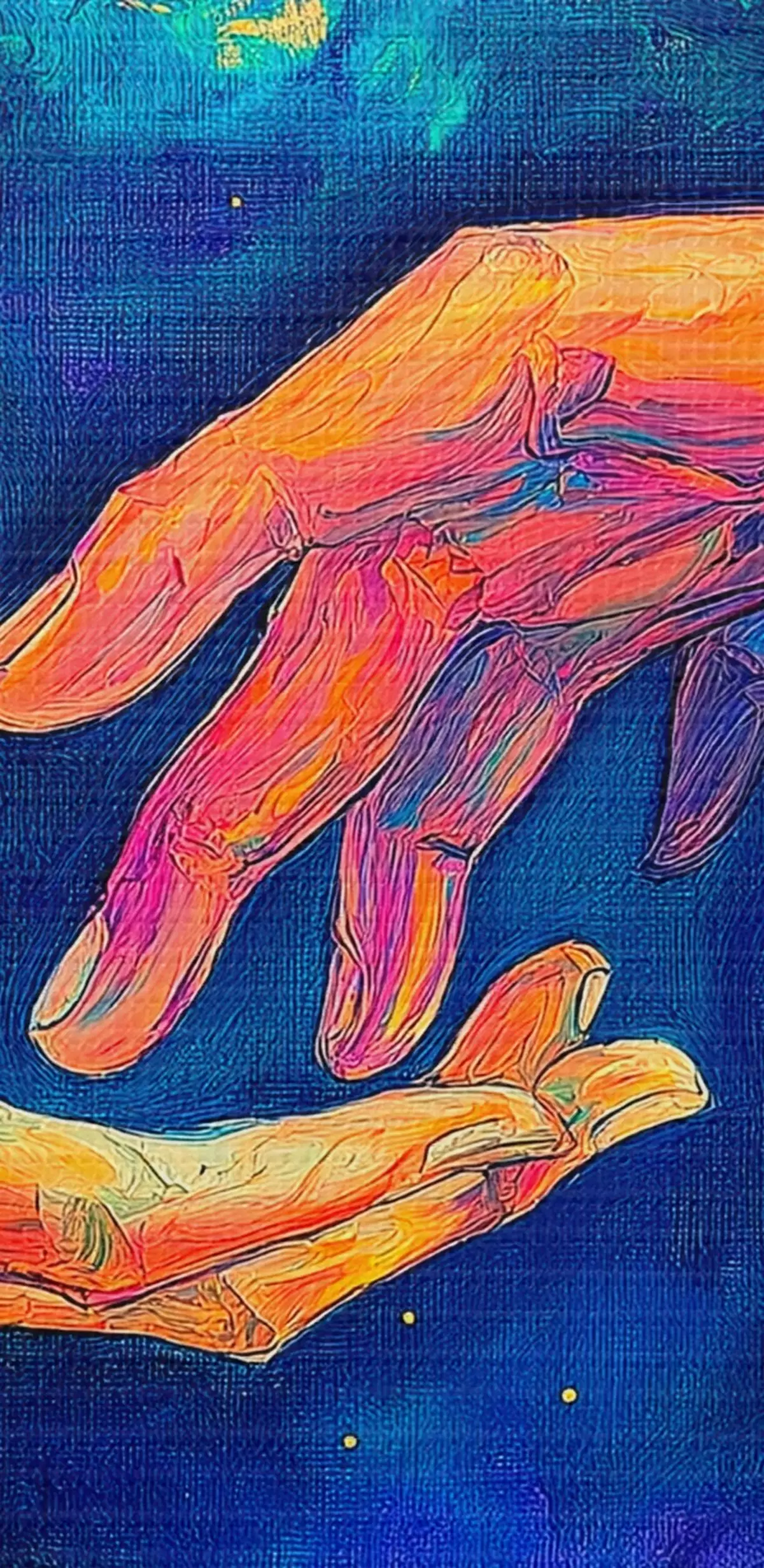 Quadri Composizione astratta di due mani che si tendono l'un l'altra, in una tavolozza di colori vivaci su uno sfondo cosmico Nr s42937