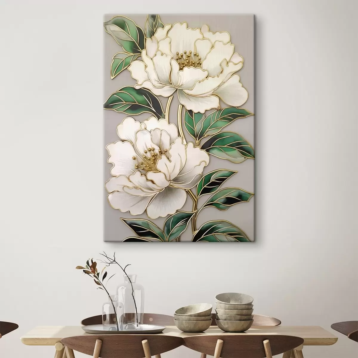 Quadri Fiori bianchi con foglie verdi in composizione decorativa Nr s43011