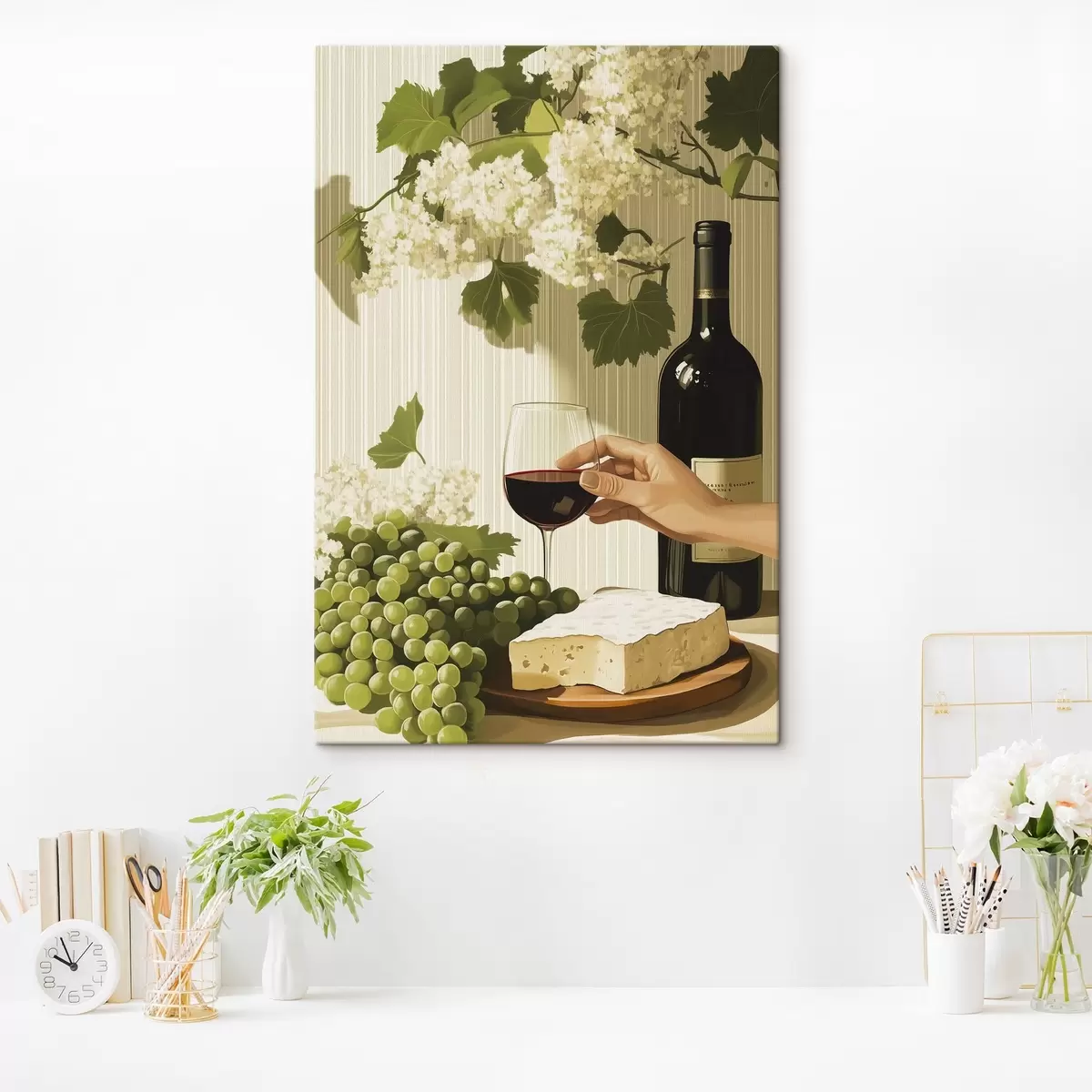 Quadri Uva con formaggio, bottiglia di vino, stile vintage, fiori bianchi Nr s43052