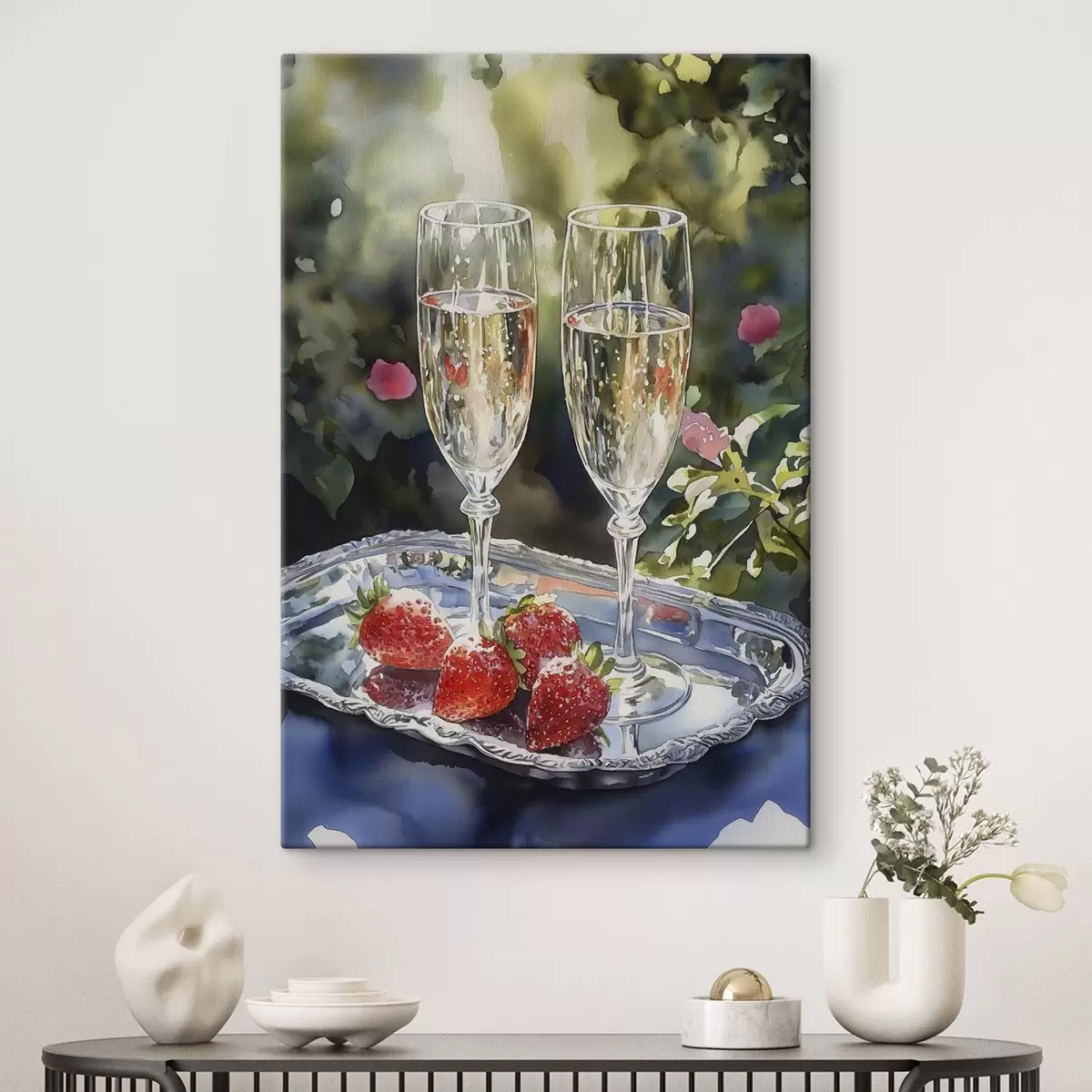 Quadri Bicchieri di champagne festosi e frizzanti con fragole sul vassoio Nr s43057