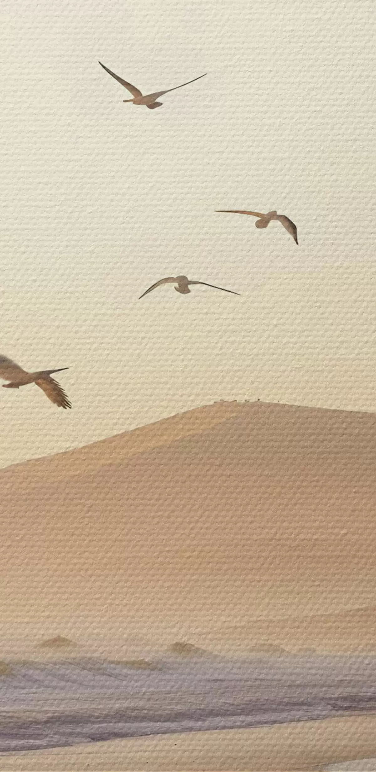 Quadri Uccelli che sorvolano la spiaggia con l'oceano e le montagne sullo sfondo, colori caldi, tavolozza pastello morbida Nr s43162