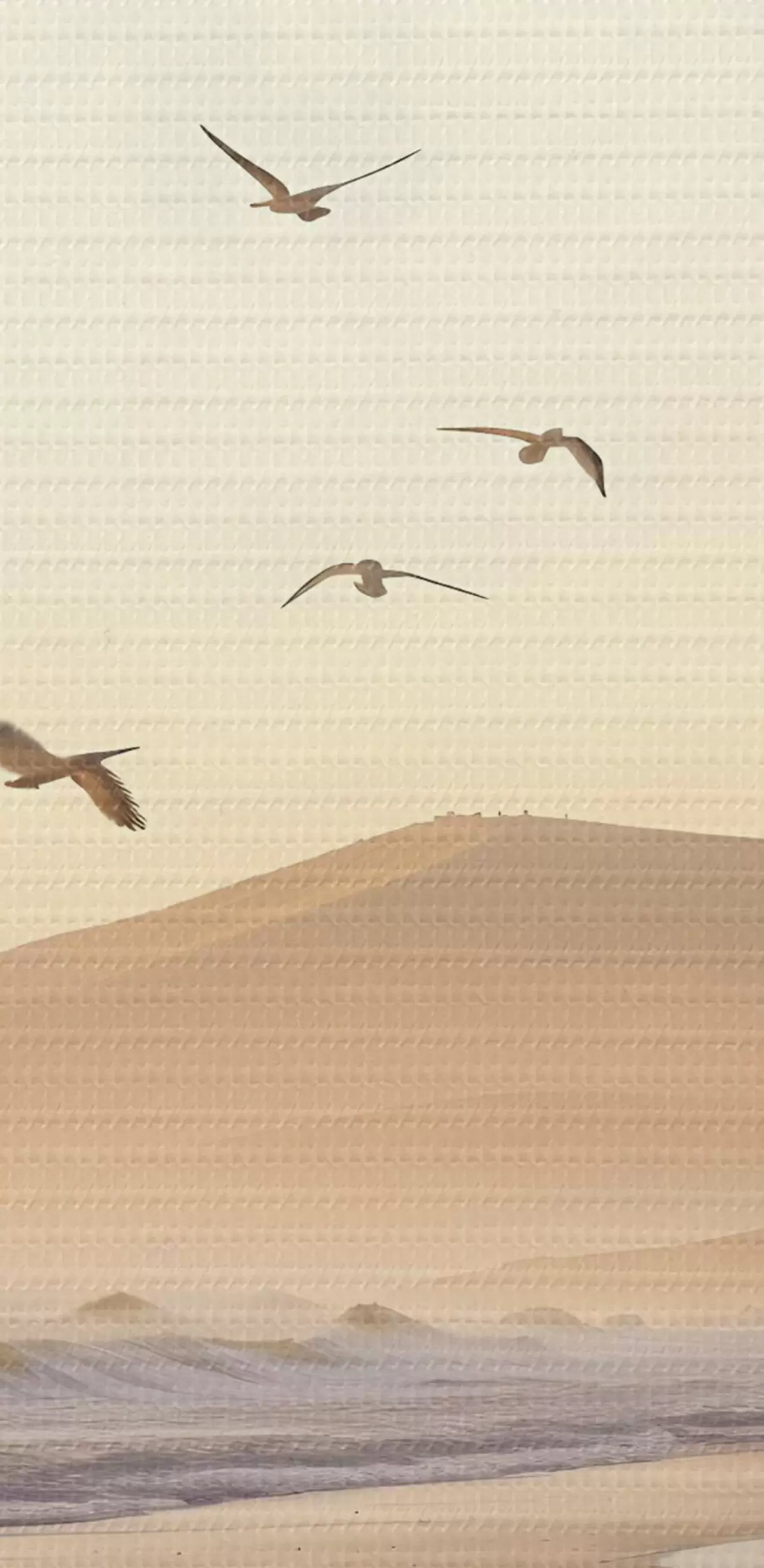 carta da parati Uccelli che sorvolano la spiaggia con l'oceano e le montagne sullo sfondo, colori caldi, tavolozza pastello morbida  nr. s43162