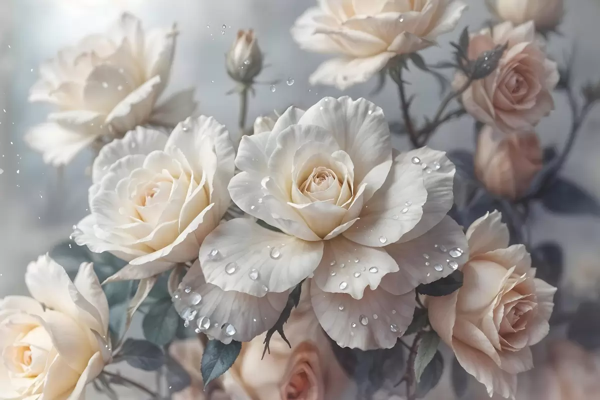 carta da parati Un gruppo di rose bianche con gocce d'acqua sui petali, alcune foglie verdi, sfondo tenue, luce soffusa nr. s43163