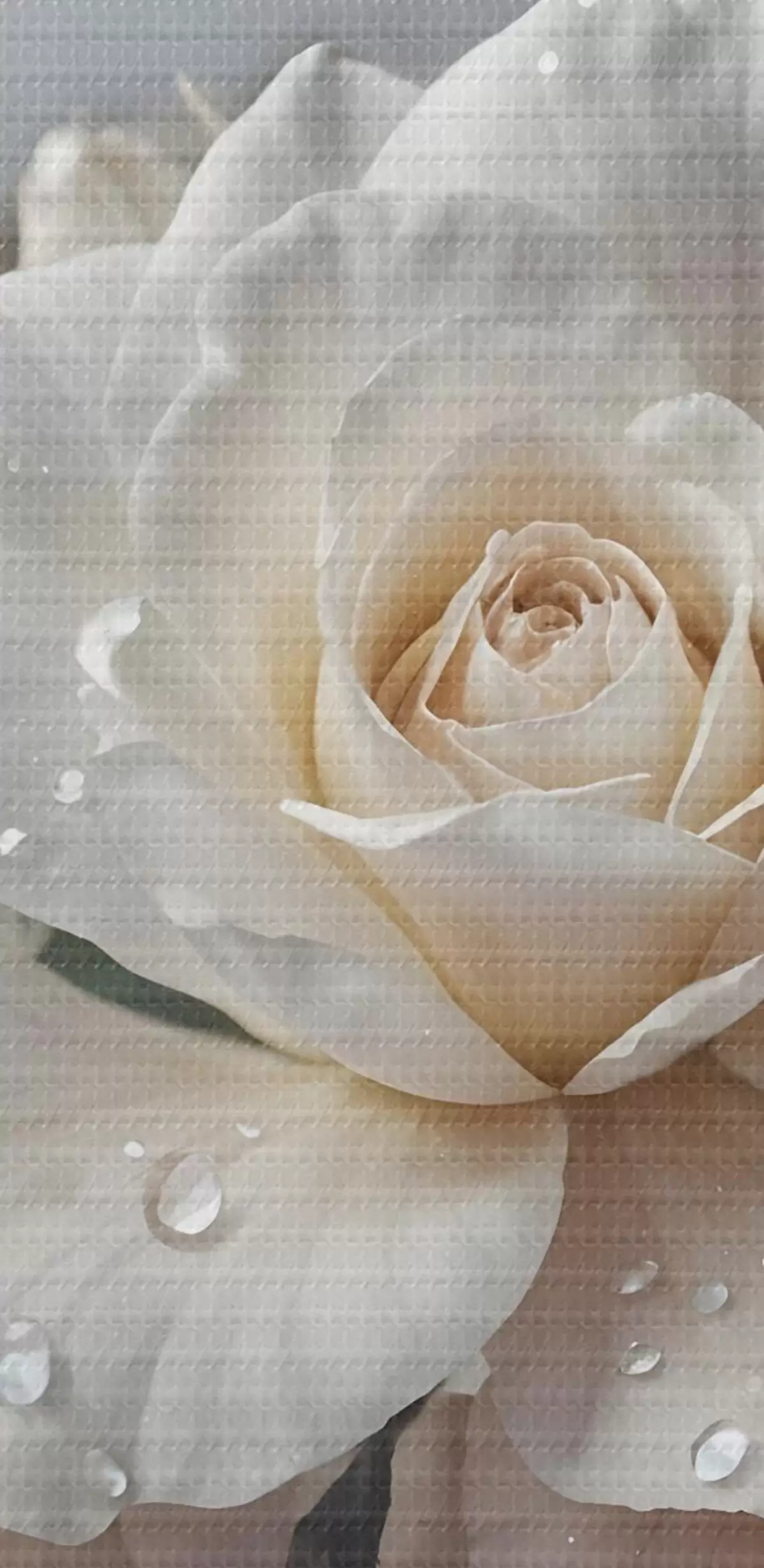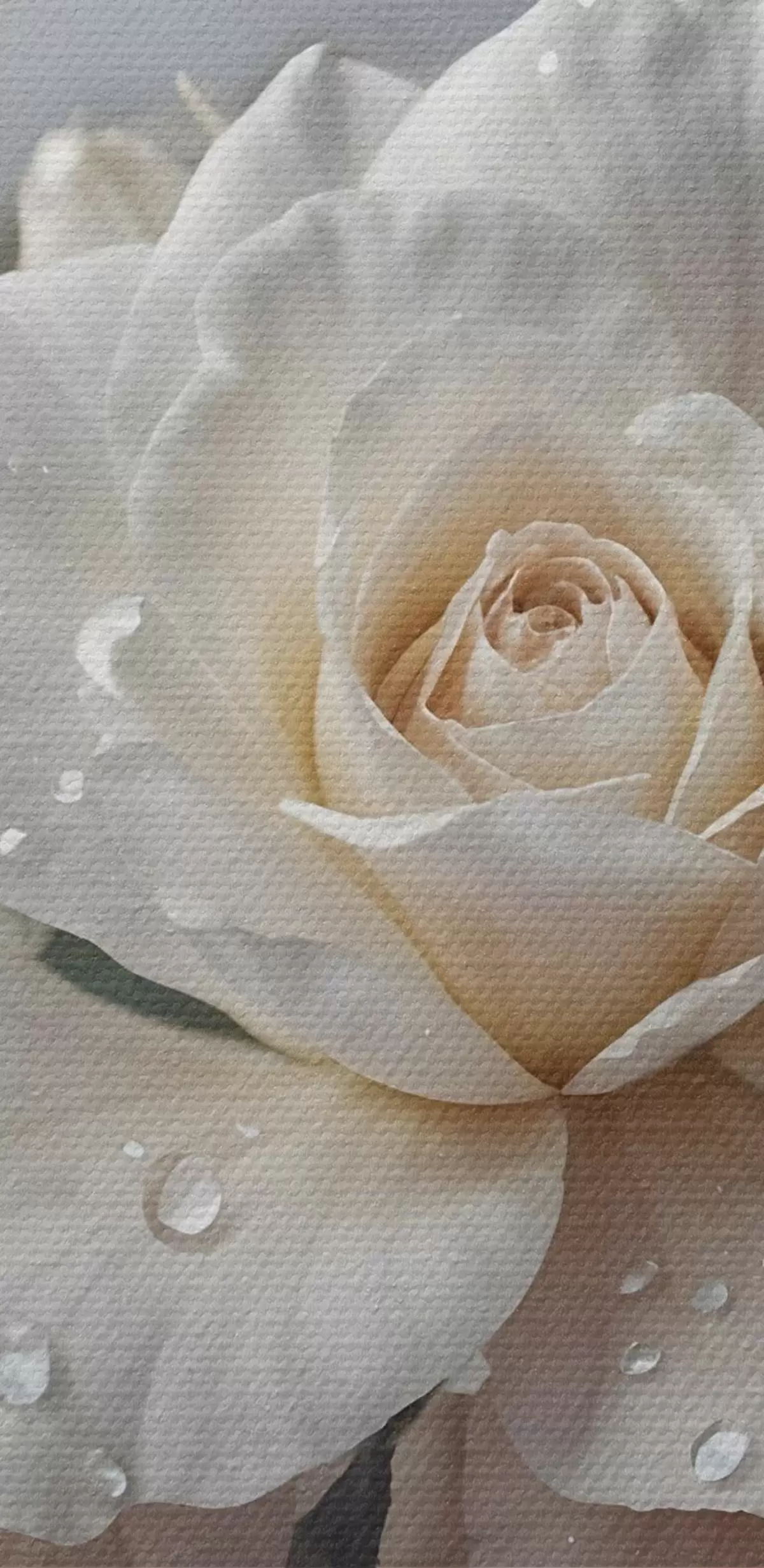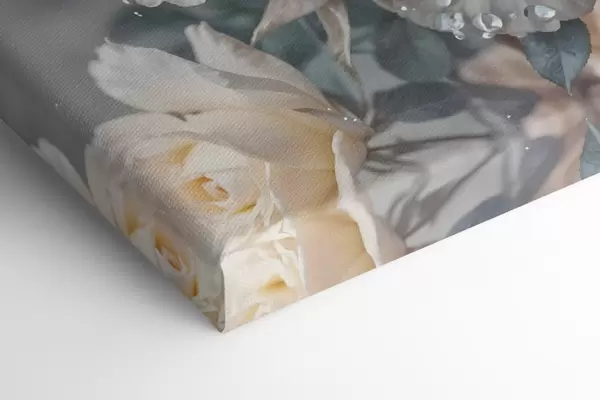 Quadri Un gruppo di rose bianche con gocce d'acqua sui petali, alcune foglie verdi, sfondo tenue, luce soffusa Nr s43163