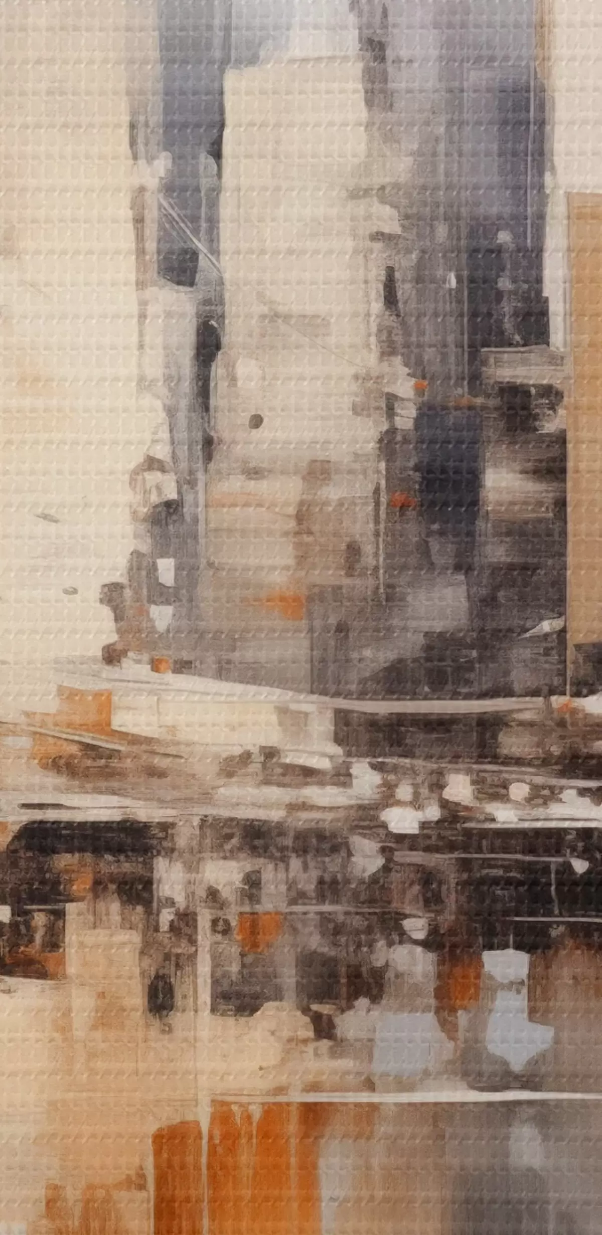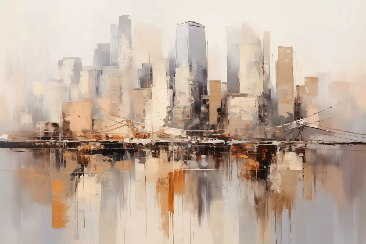 Quadri Quadro astratto di paesaggio urbano con alti edifici nei toni del marrone, del grigio e del bianco, riflessi nell'acqua sottostante Nr s43168